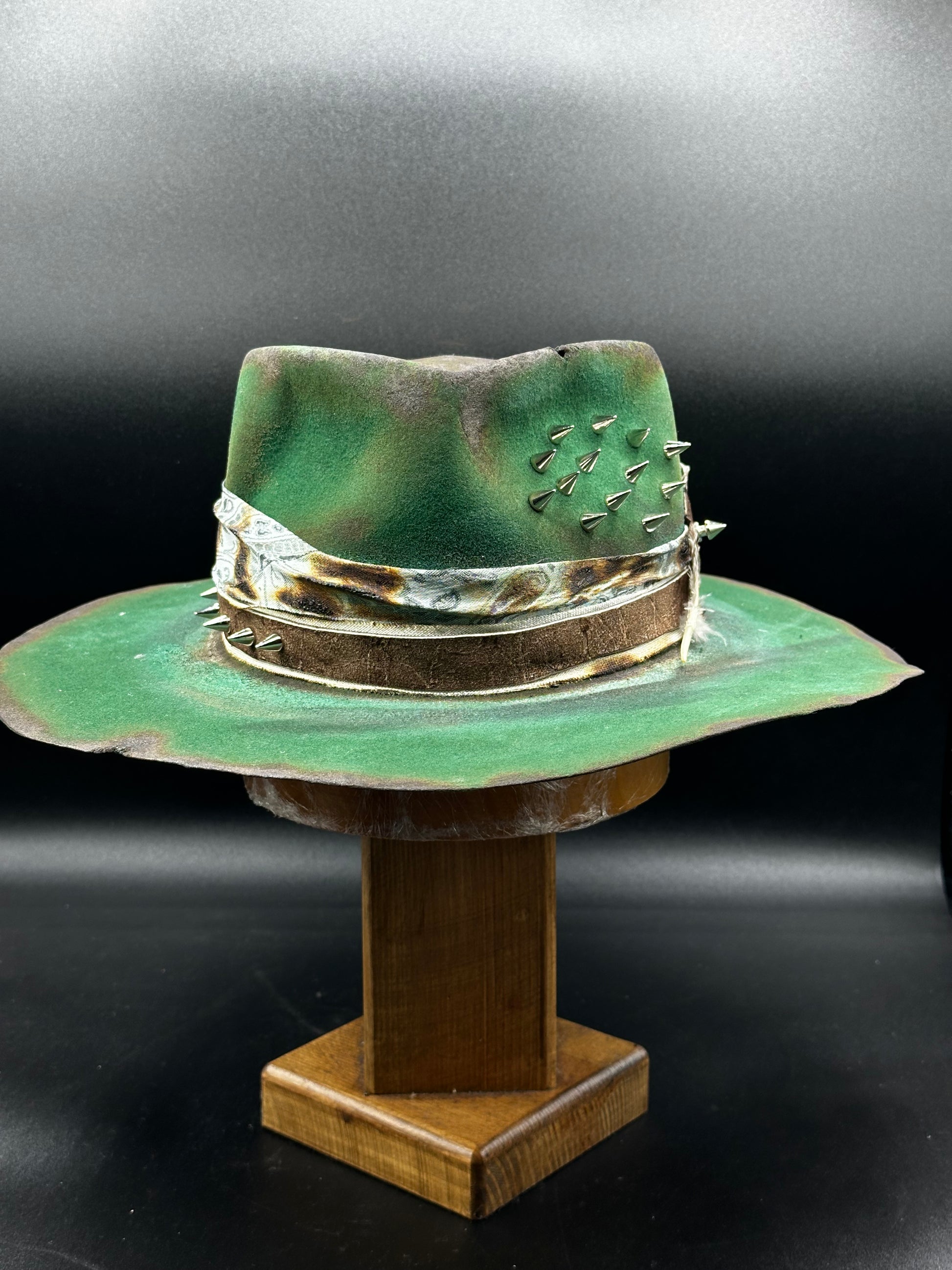 Scopri il carattere deciso di un cappello che non segue le mode, ma le crea. Questo cappello artigianale verde con effetto vintage bruciato è pensato per chi cerca un accessorio distintivo, fuori dagli schemi, capace di raccontare una storia attraverso ogni dettaglio.