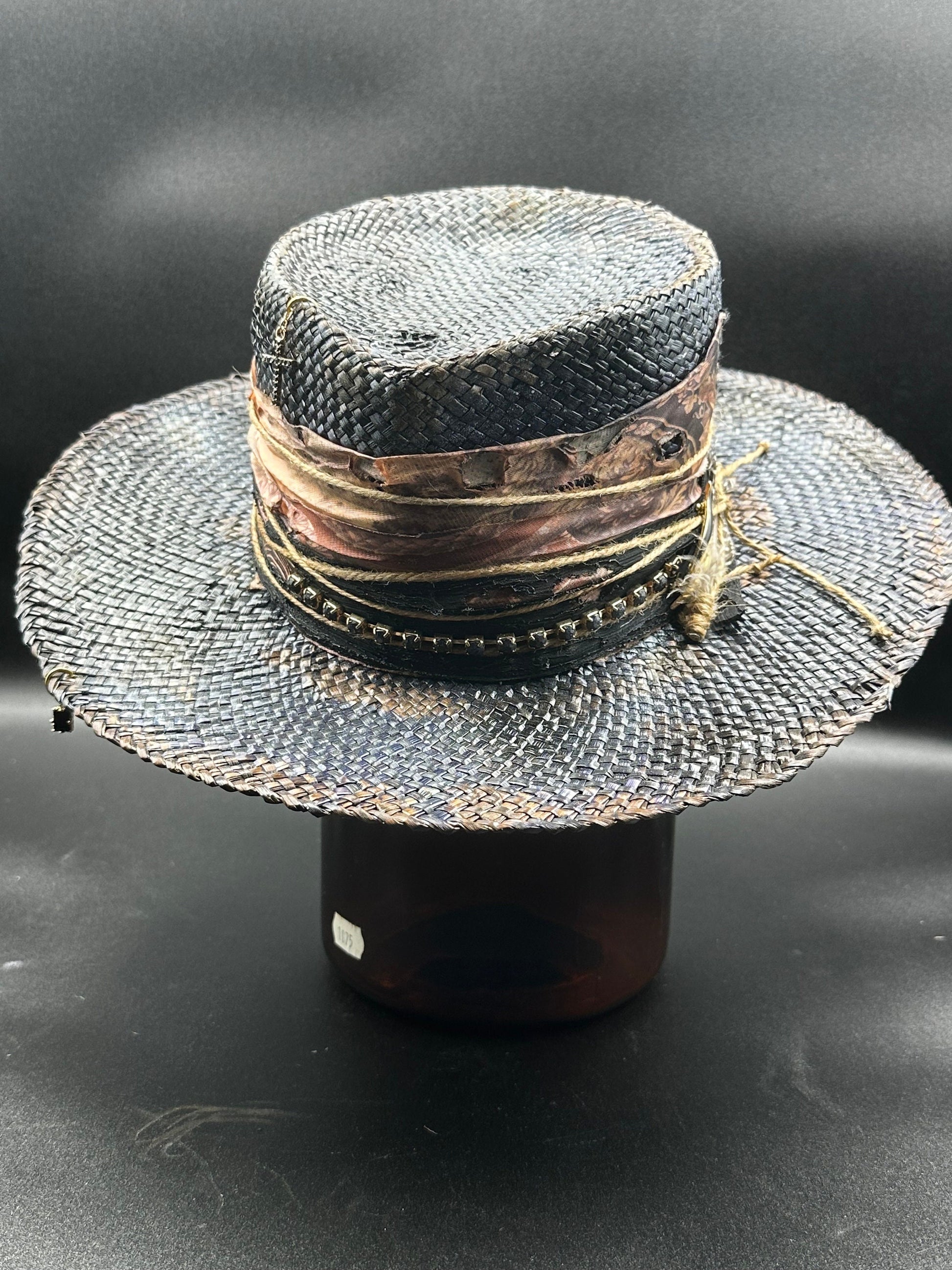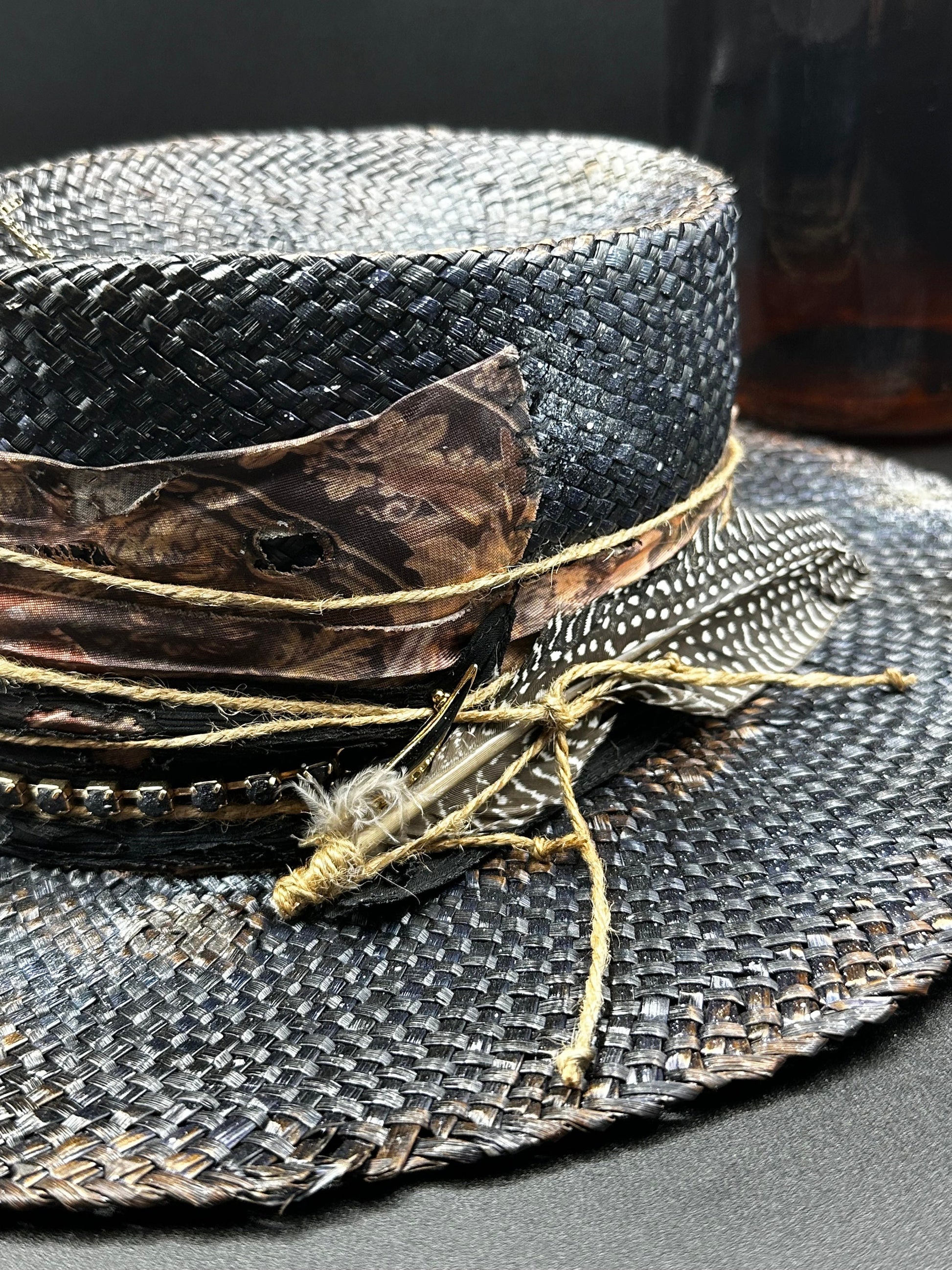 Scopri l’eleganza senza tempo con il nostro cappello vintage in paglia nera, realizzato a mano con cura e attenzione ai dettagli. Questo cappello è decorato con una raffinata gravatta e una spilla vintage, impreziosita da una piuma di fagiano e cristalli neri, che aggiungono un tocco di lusso e distinzione.
