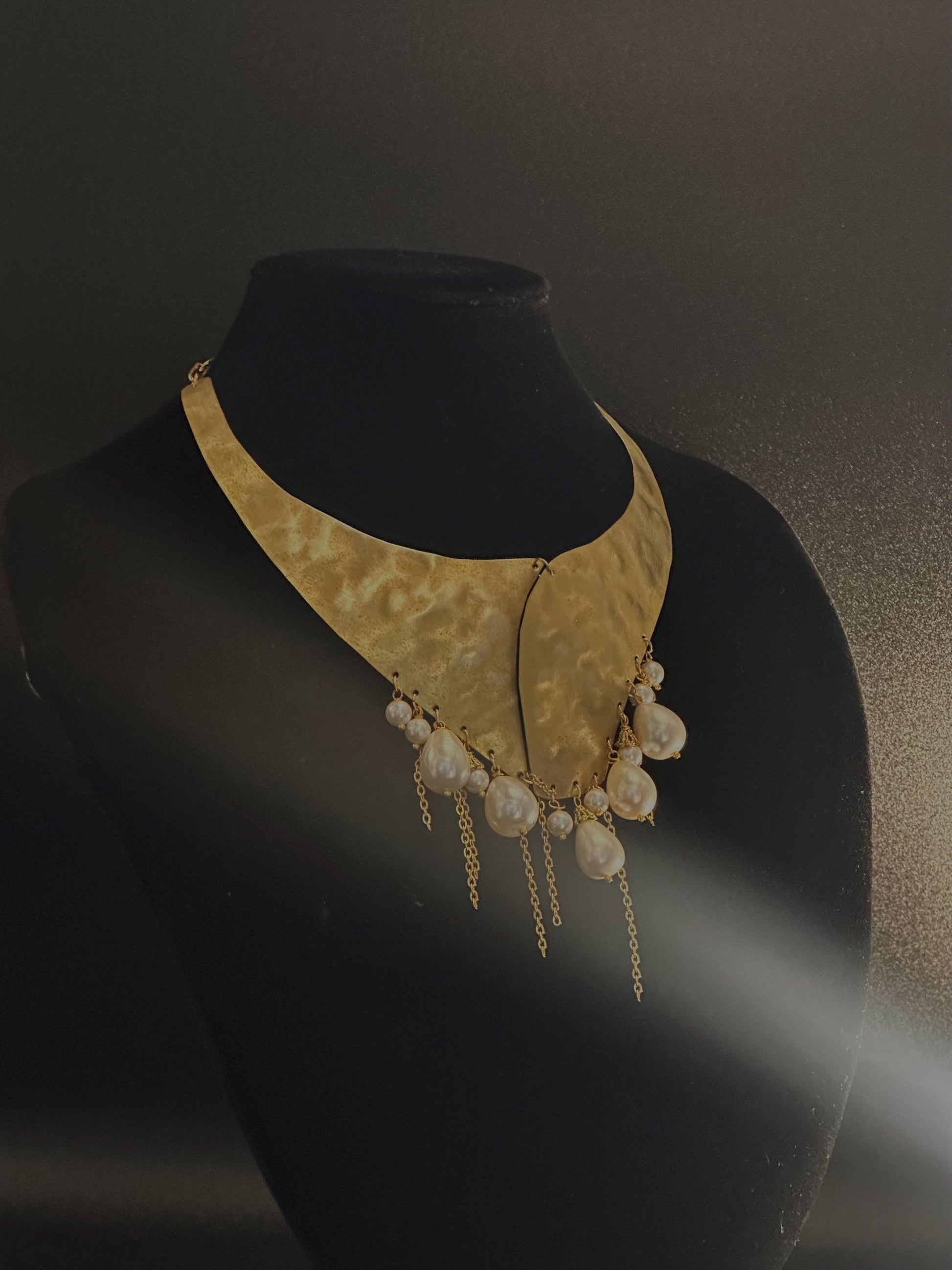 Questa collana è un capolavoro di artigianato che unisce eleganza e unicità. Realizzata interamente a mano, è composta da una base in ottone martellato, che crea un effetto luminoso e distintivo, e impreziosita da raffinate perle barocche pendenti, ognuna unica nella sua forma naturale.