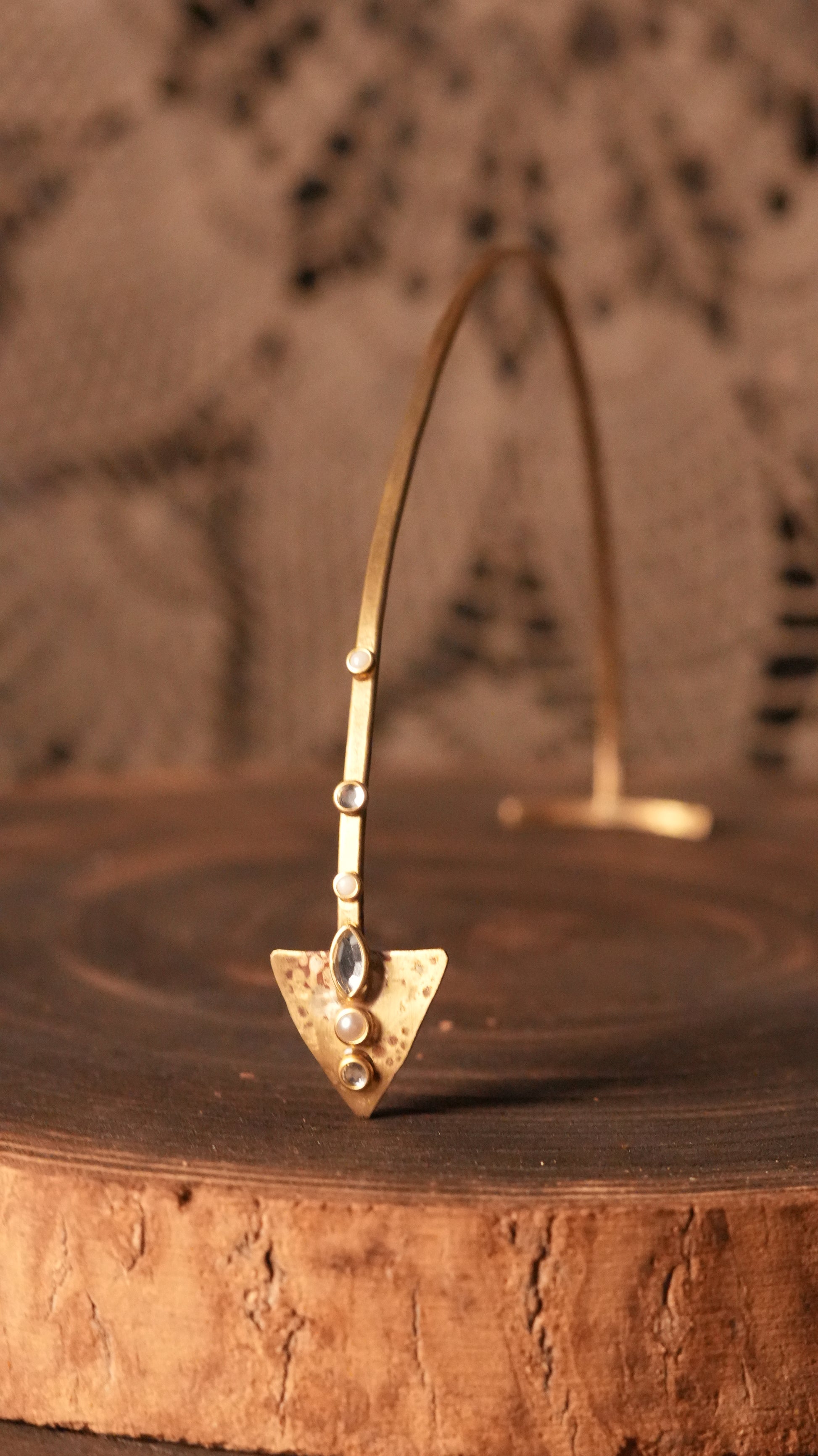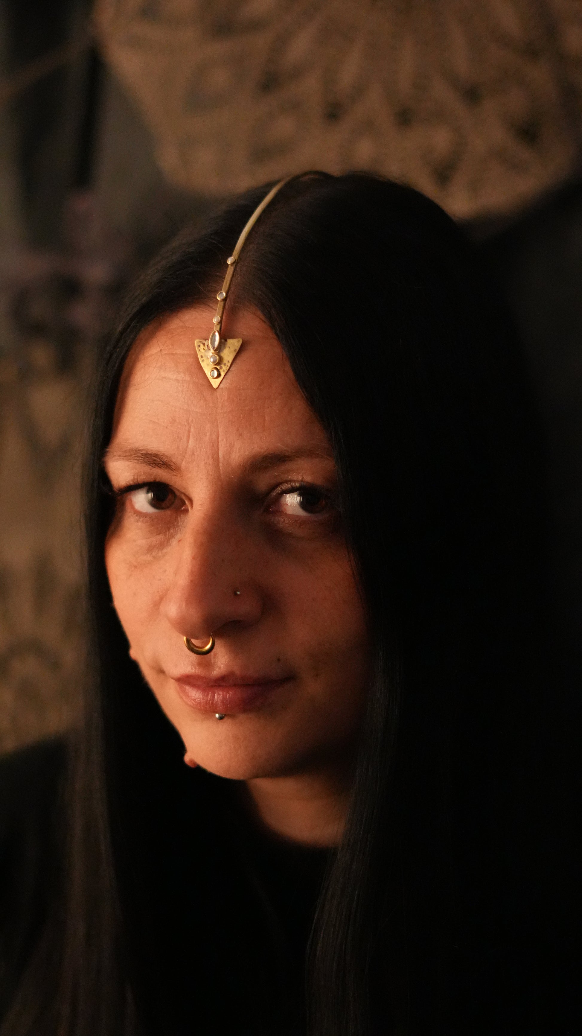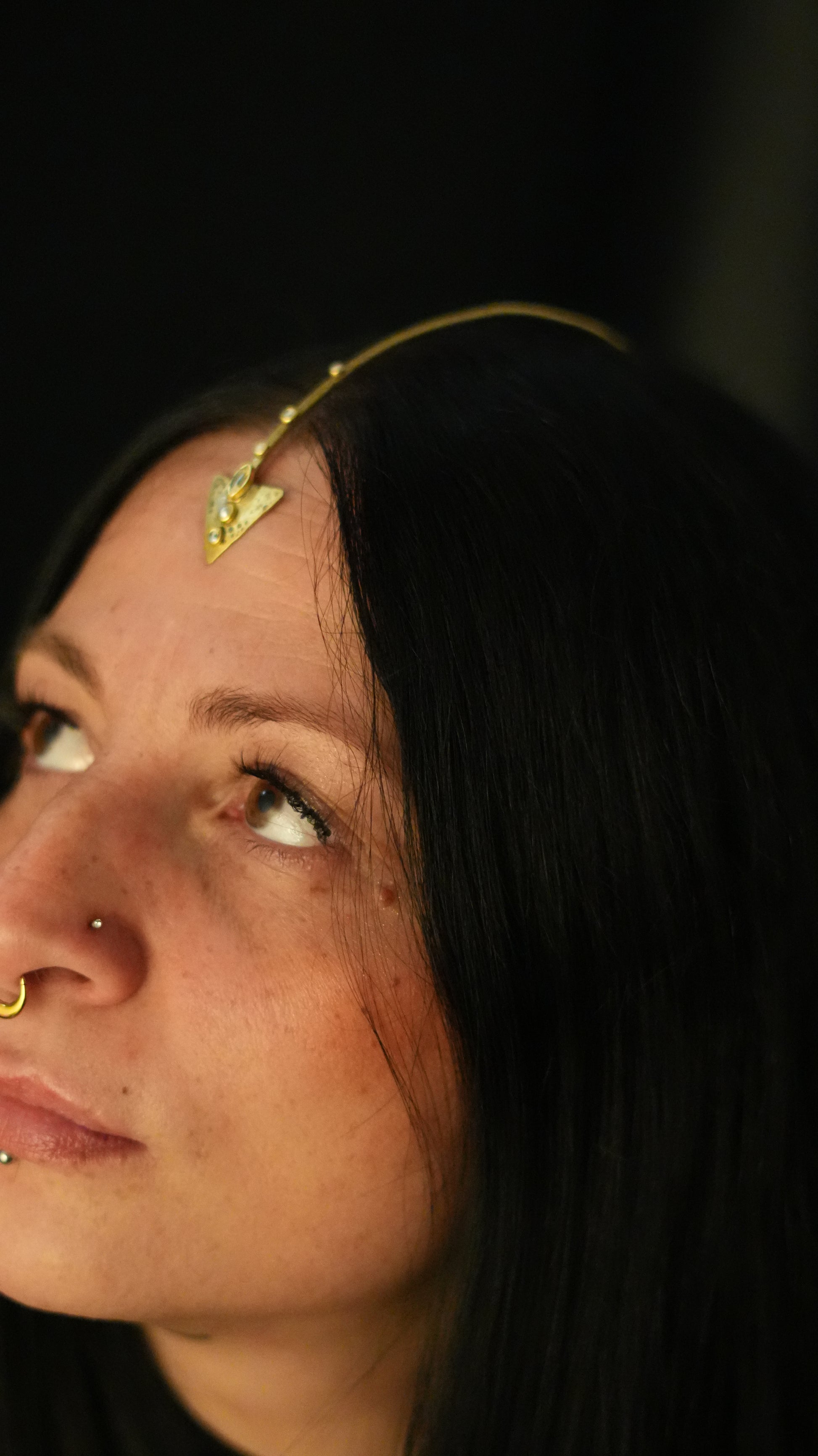 Si appoggia sulla testa in modo stabile e naturale, seguendo la linea del viso senza stringere e senza dare fastidio.È un accessorio leggero ma deciso: non è un ornamento, è un segno.
