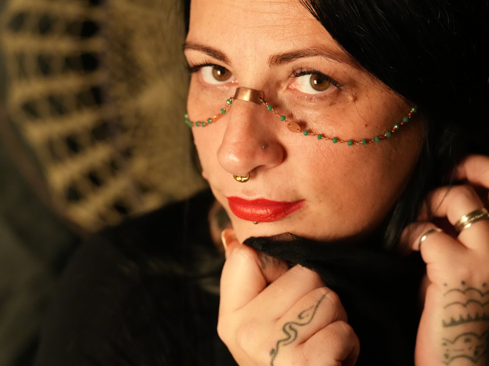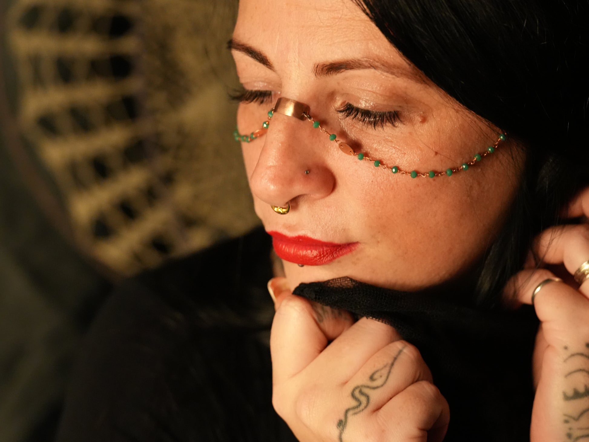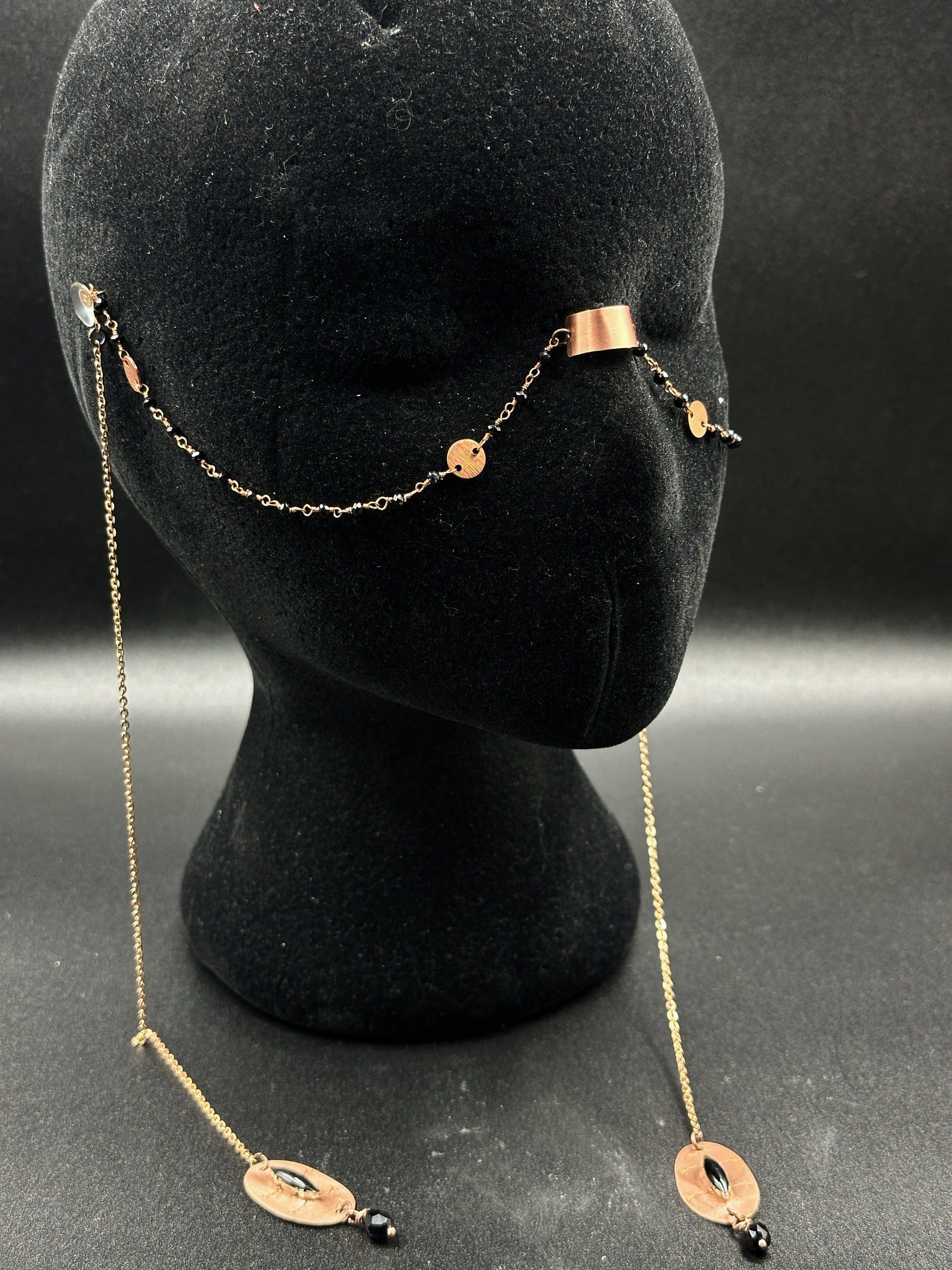 Face Chain copper Tears: un accessorio unico che fonde eleganza e modernità. Realizzato a mano con naselli regolabili in rame, catene in acciaio inossidabile e pendenti in cristallo neri, questo decoro per il viso offre comfort su ogni forma del viso.