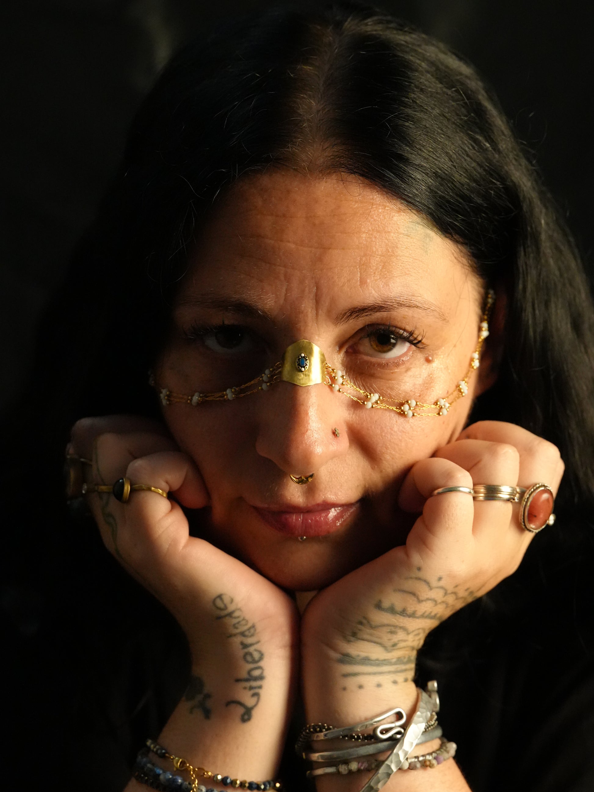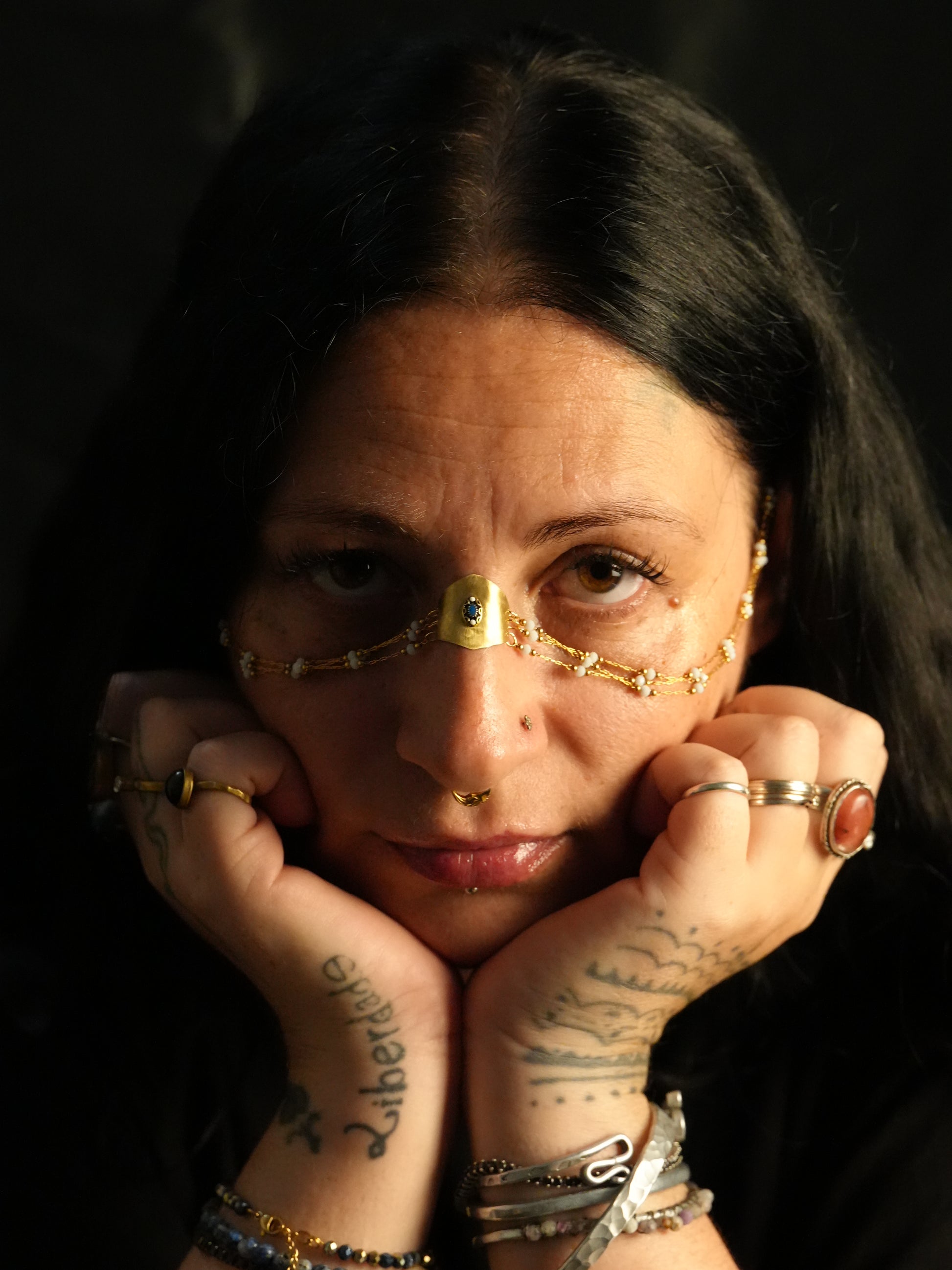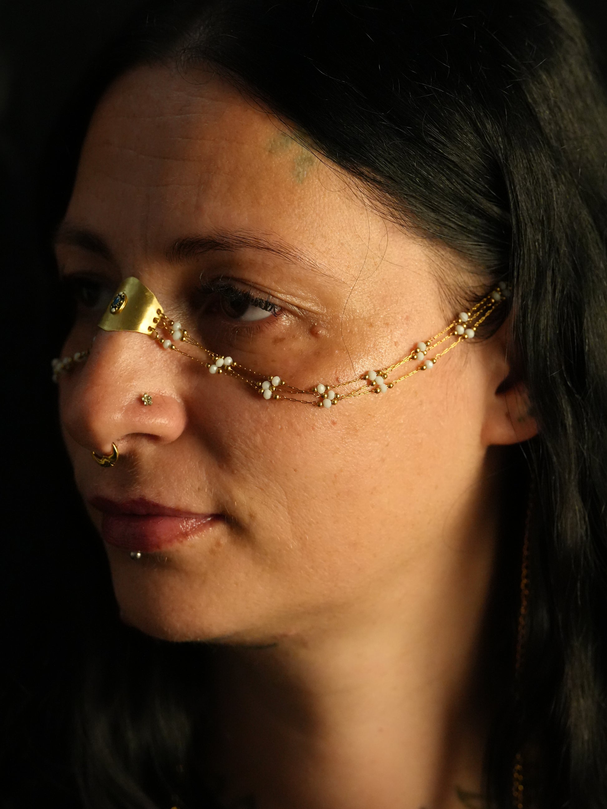 - Fili sottili in acciaio dorato che scorrono sul volto come carezze