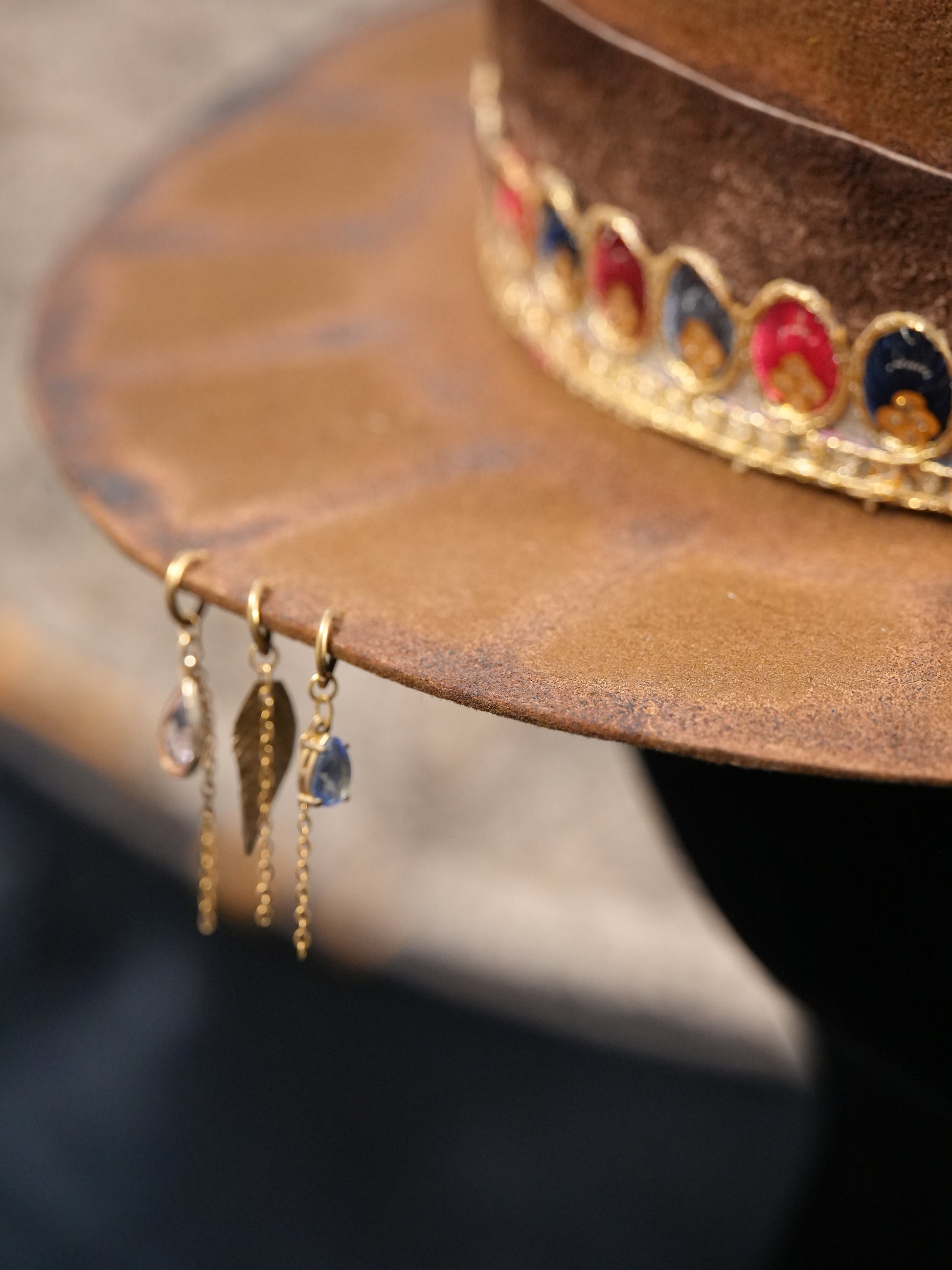 Realizzato interamente a mano, questo modello in feltro marrone è arricchito da una passamaneria indiana ricca di colori e texture, che corre lungo la fascia creando un contrasto vibrante e sofisticato.