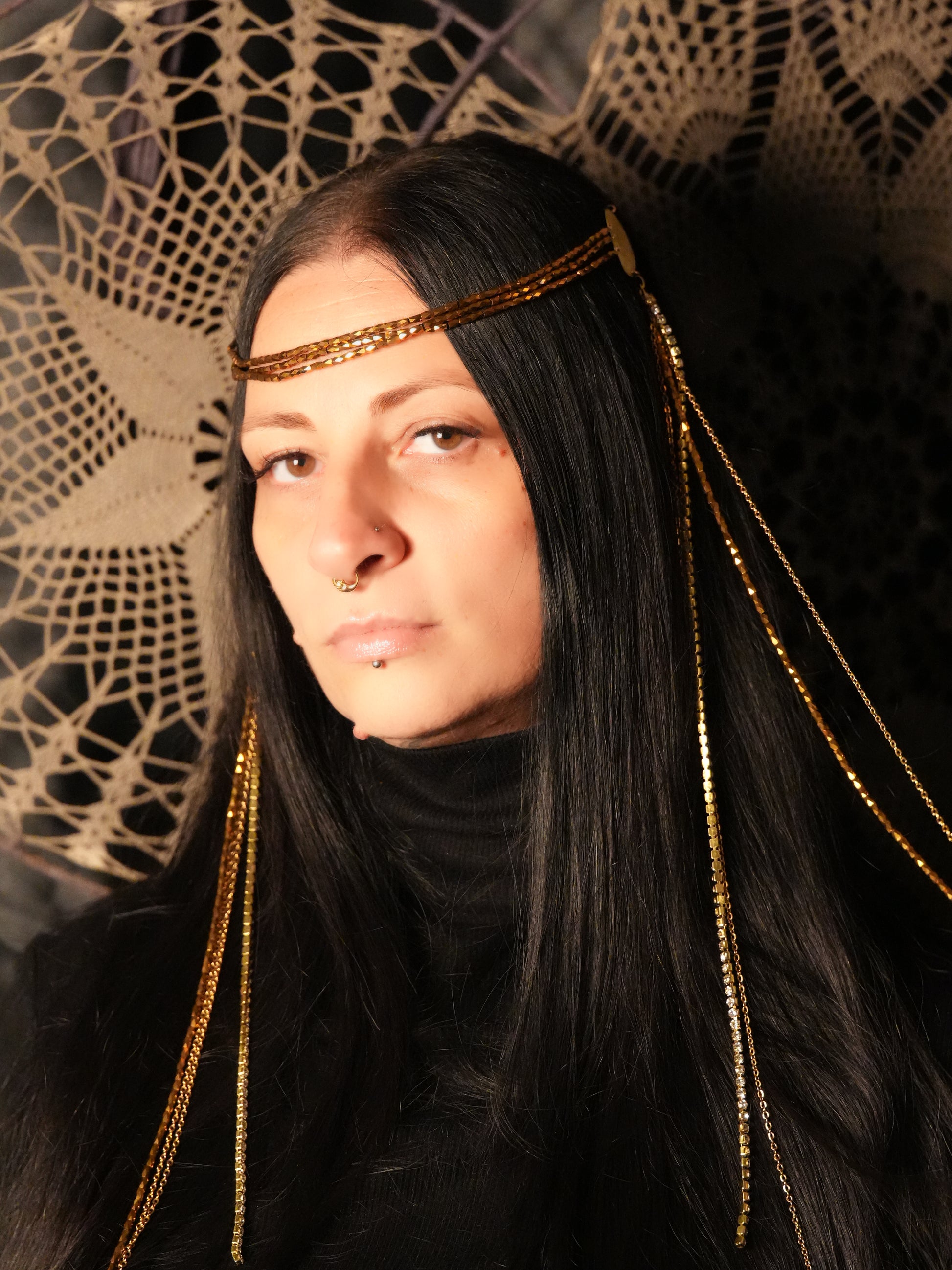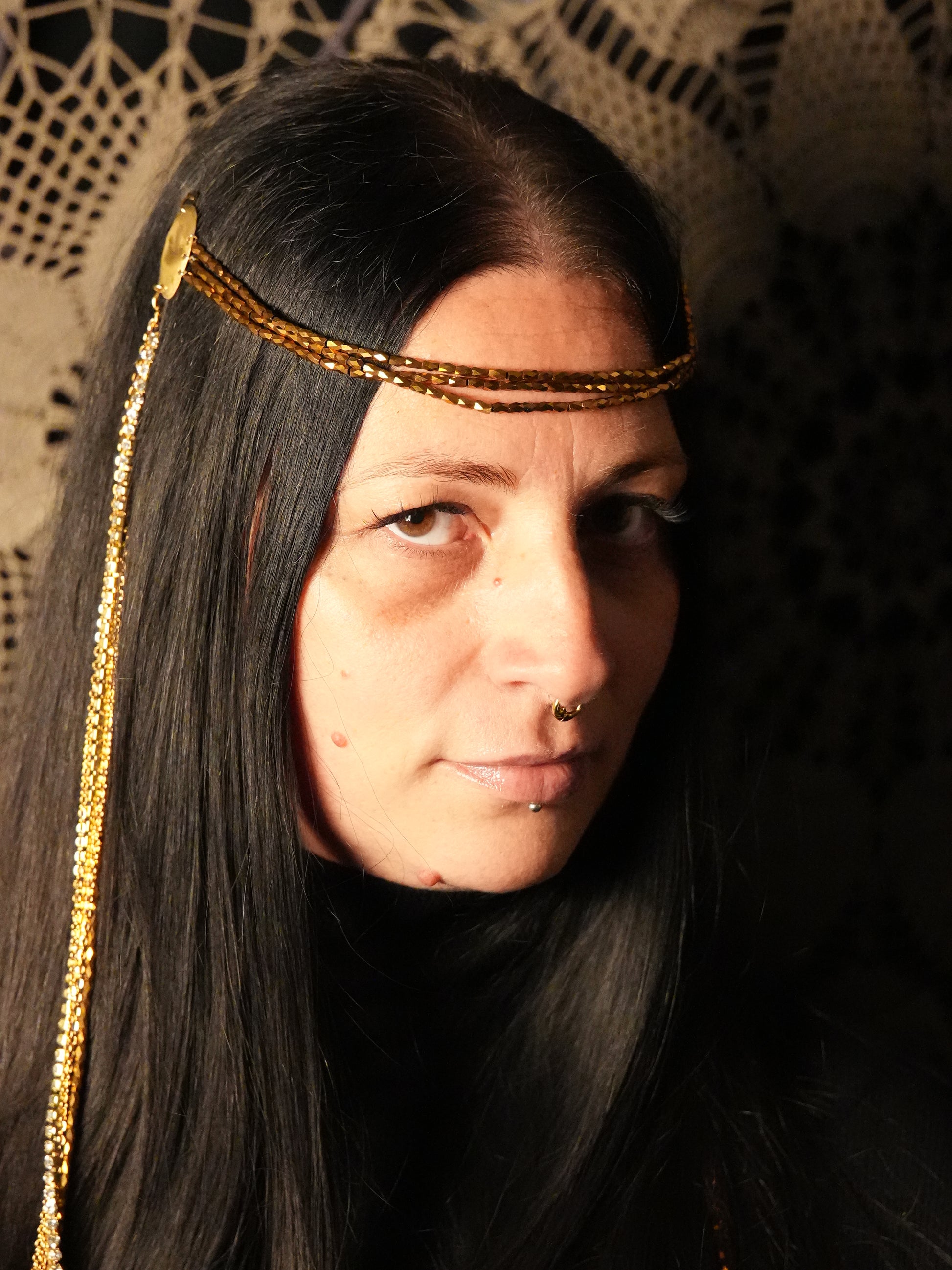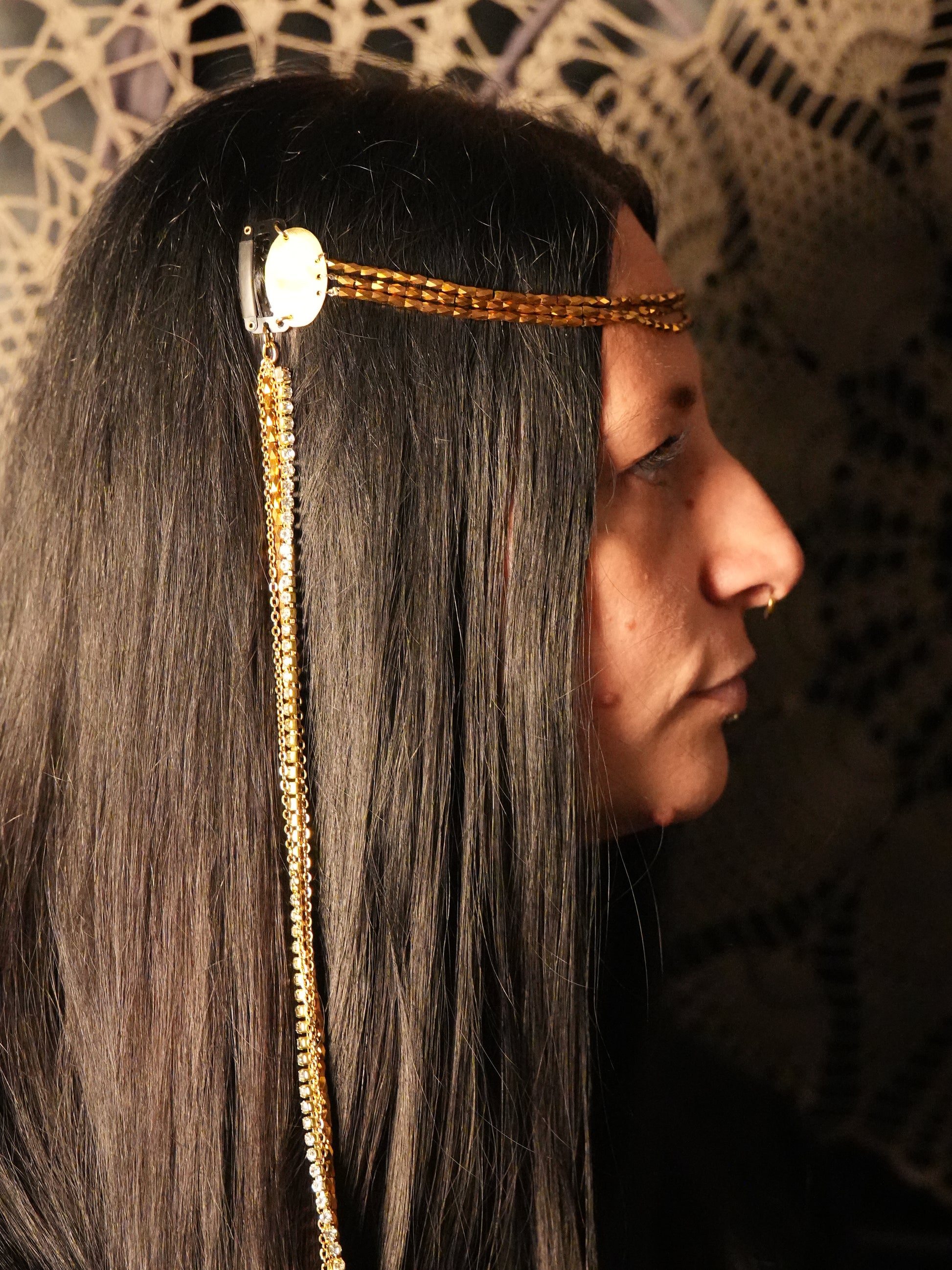Realizzato con catene leggere in acciaio dorato, pendenti e placche in ottone, e impreziosito da strass e cristalli, questo accessorio si posa con eleganza sul viso senza tirare o impigliarsi tra i ricci.