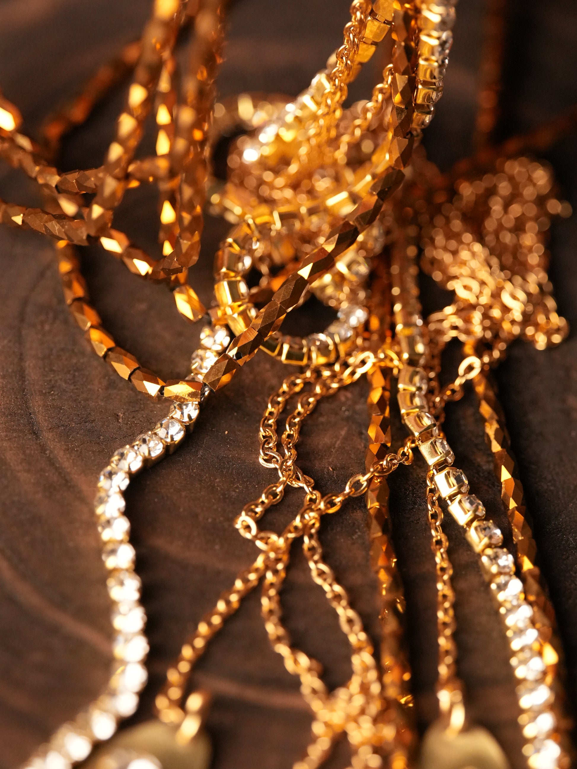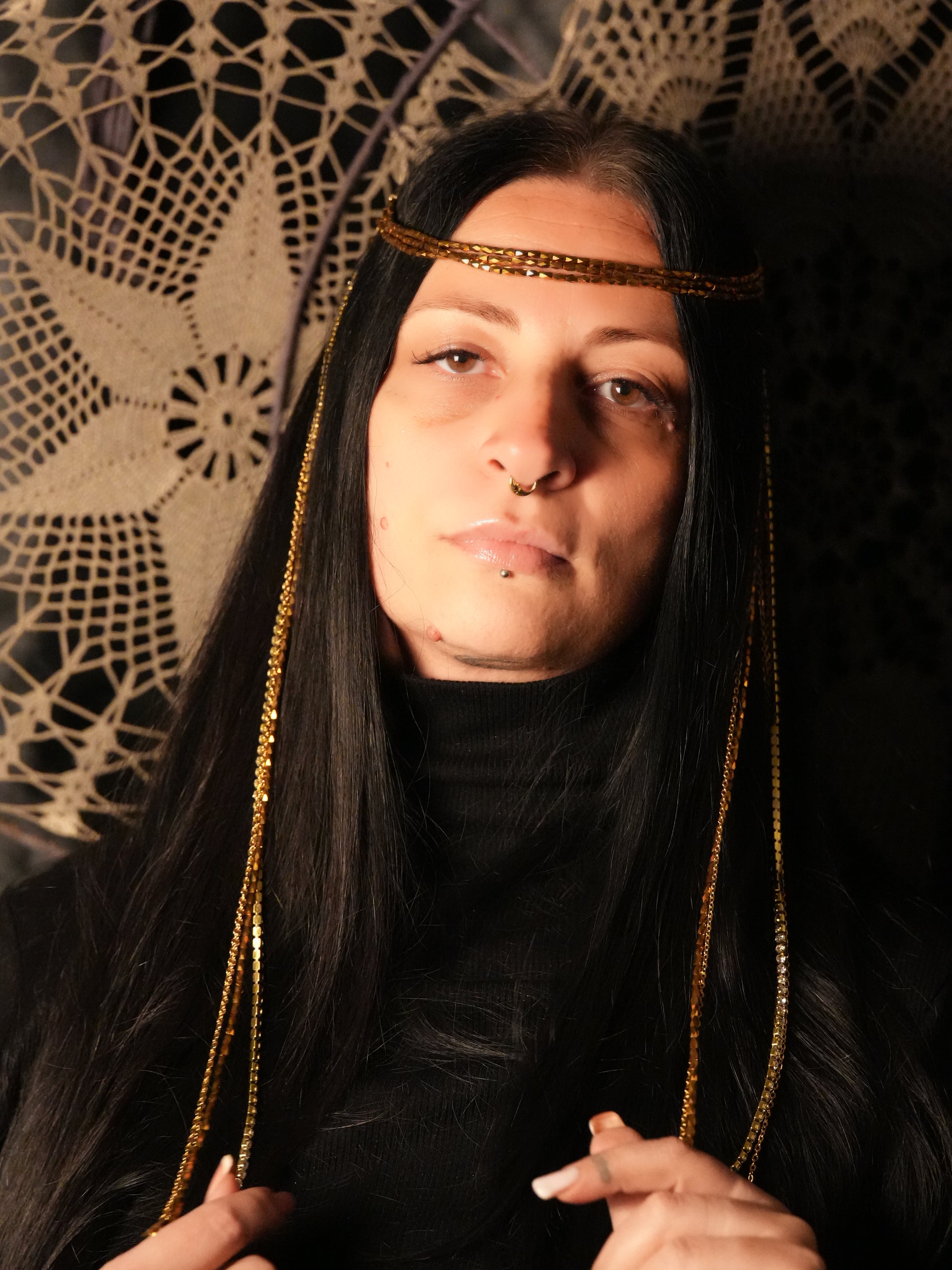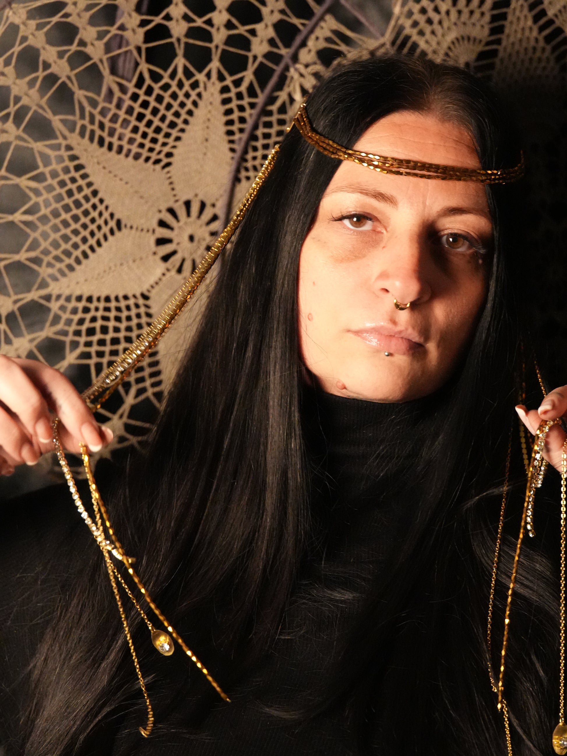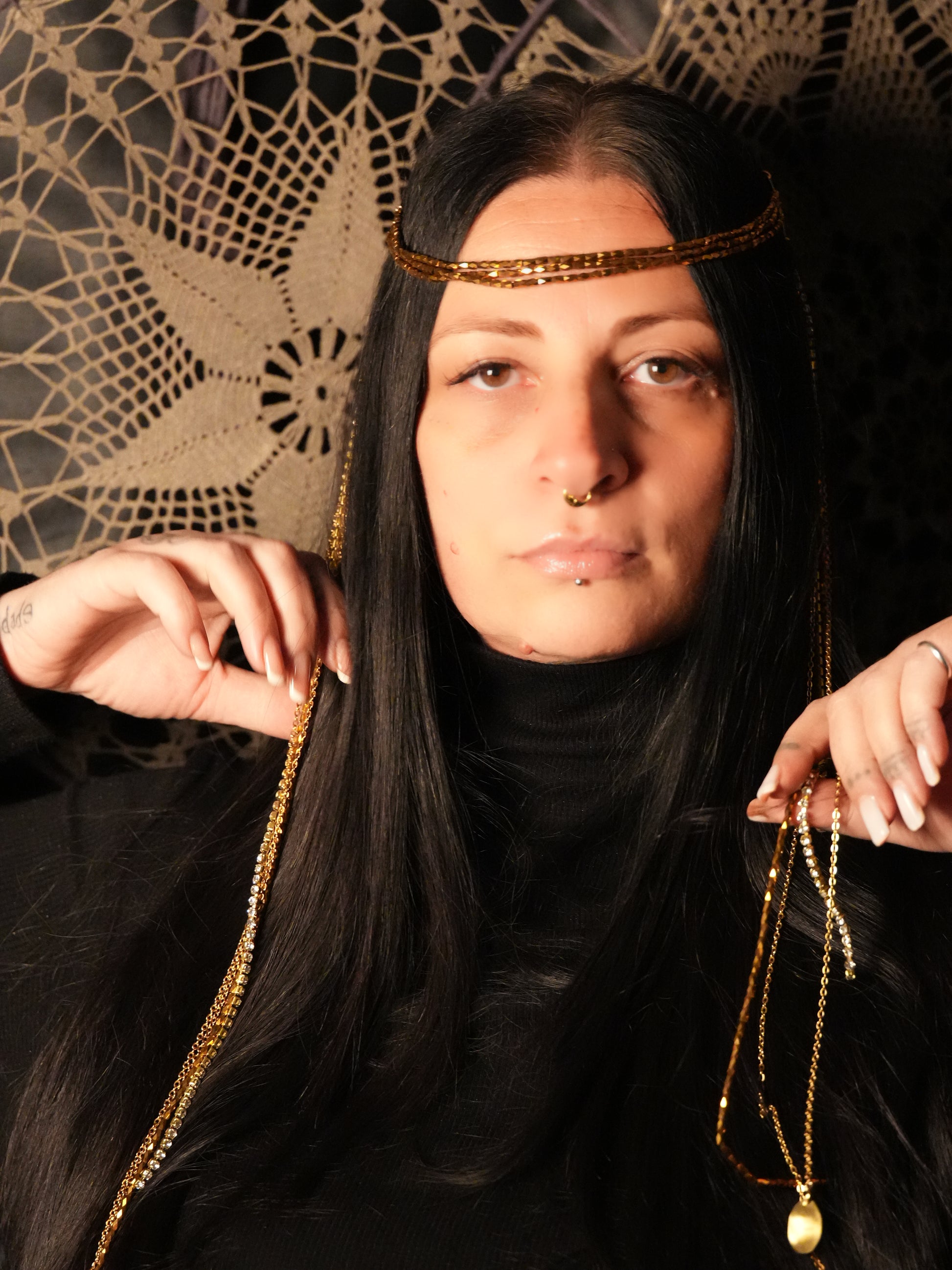 Realizzato con catene leggere in acciaio dorato, pendenti e placche in ottone, e impreziosito da strass e cristalli, questo accessorio si posa con eleganza sul viso senza tirare o impigliarsi tra i ricci.