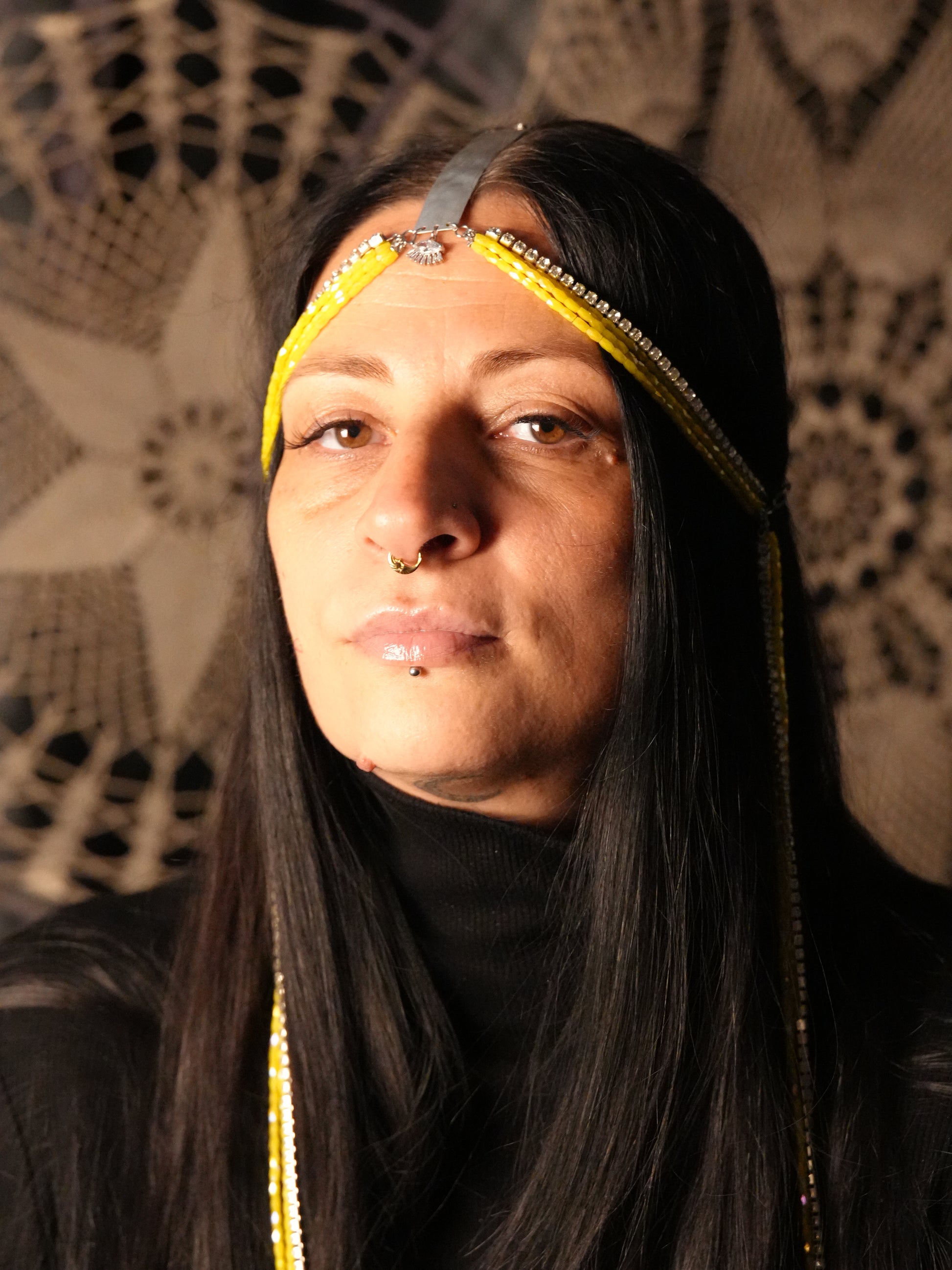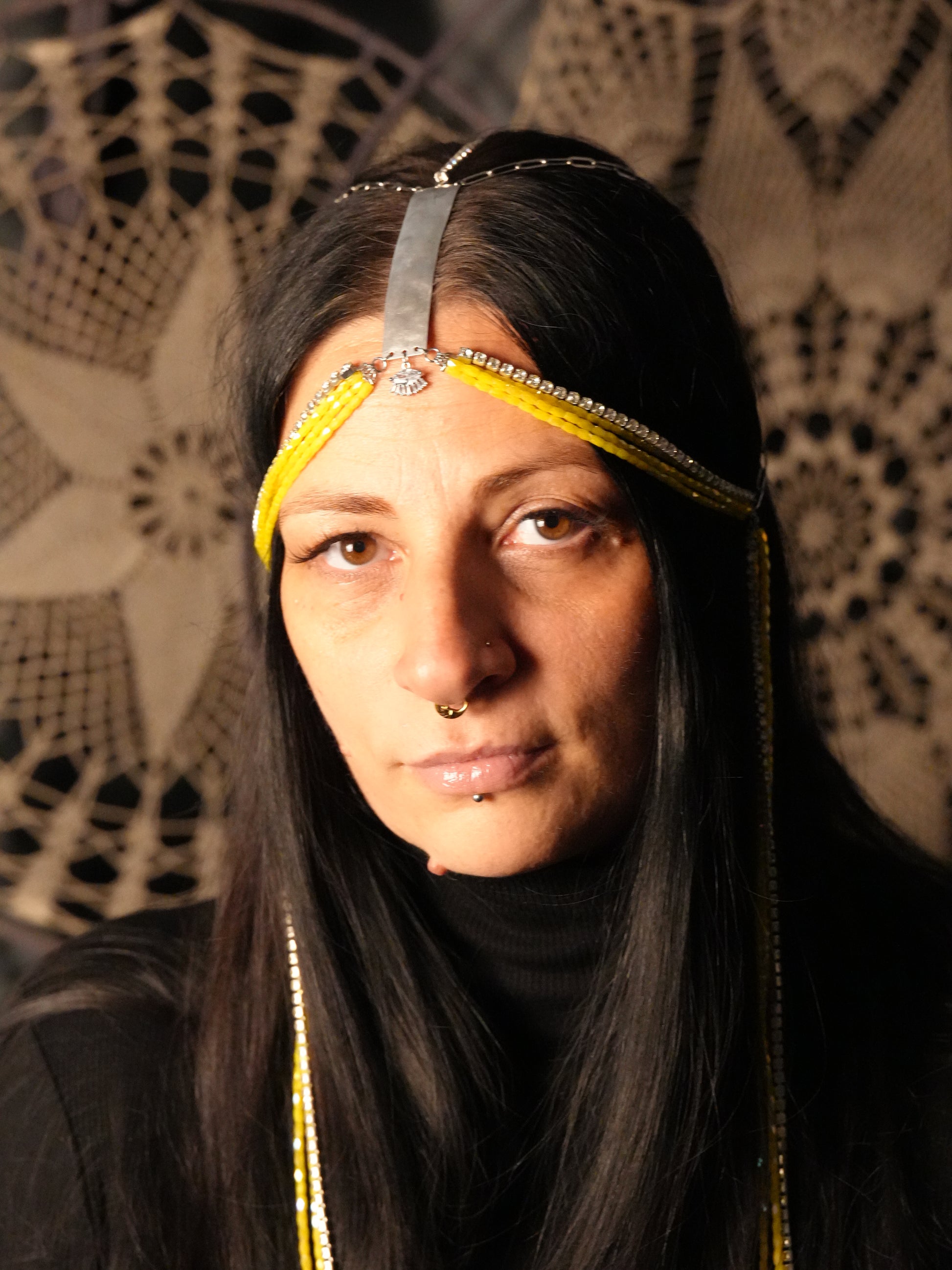 Ispirata agli anni ruggenti ma con uno spirito contemporaneo, la Head Chain Flapper è l’accessorio perfetto per chi ama distinguersi. Il design combina semicristalli baguette color lime, una cascata di cristalli neutri e una placca centrale in alluminio, creando un equilibrio tra luminosità e leggerezza.