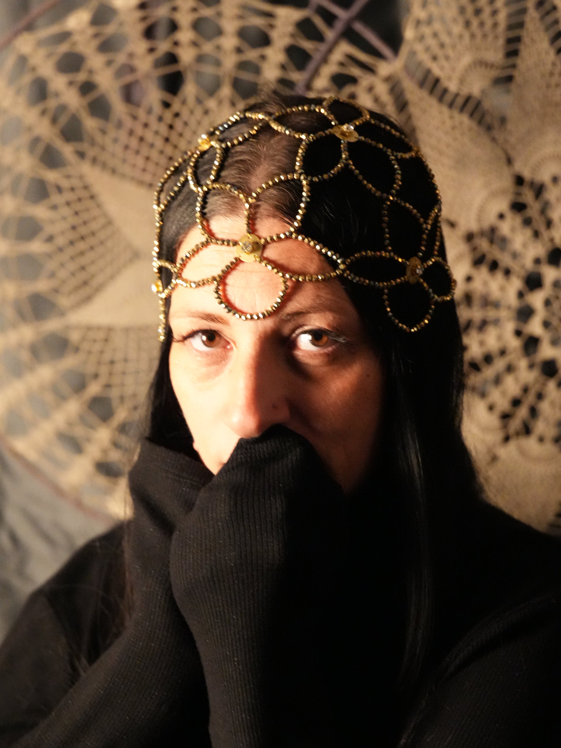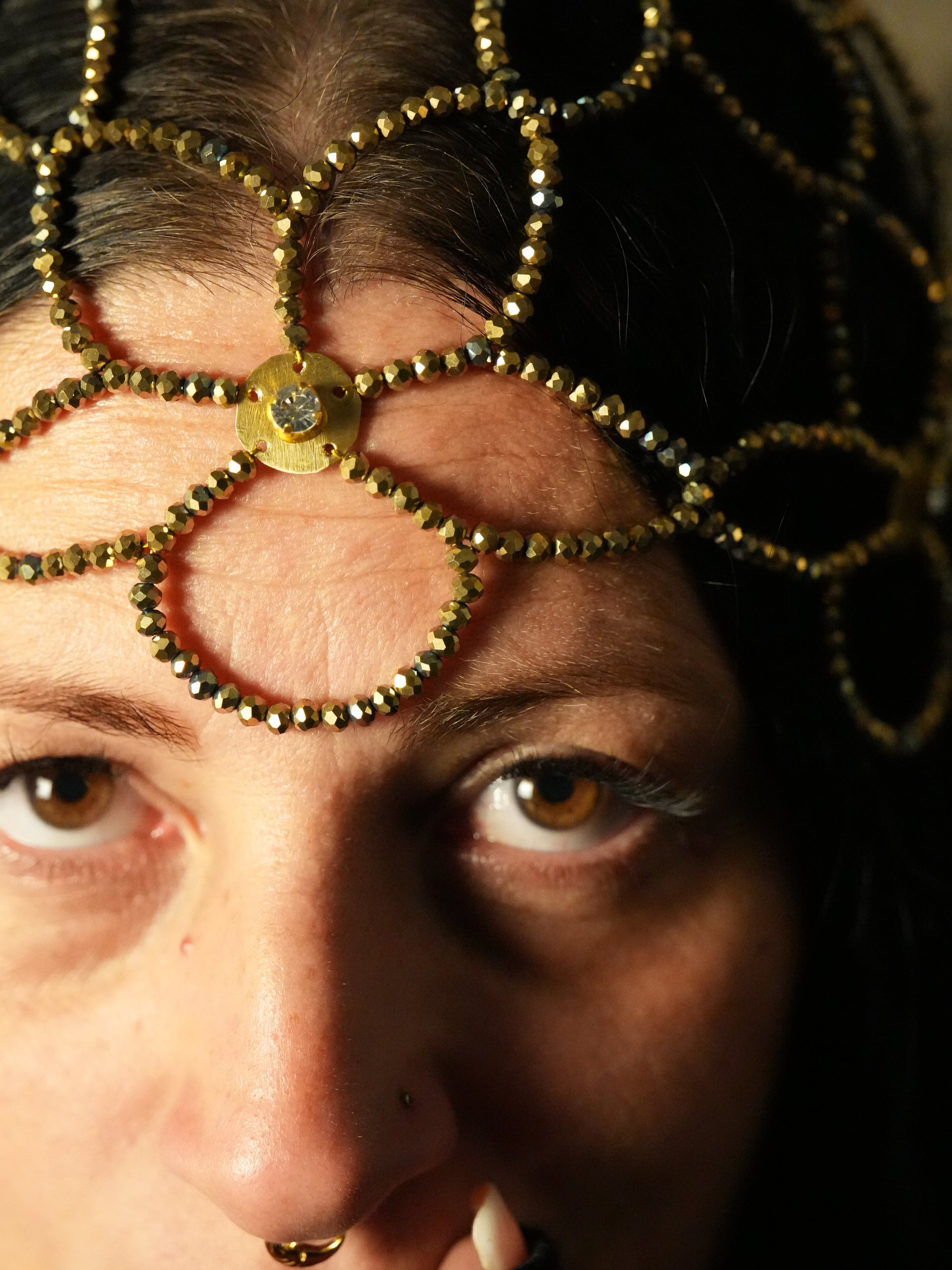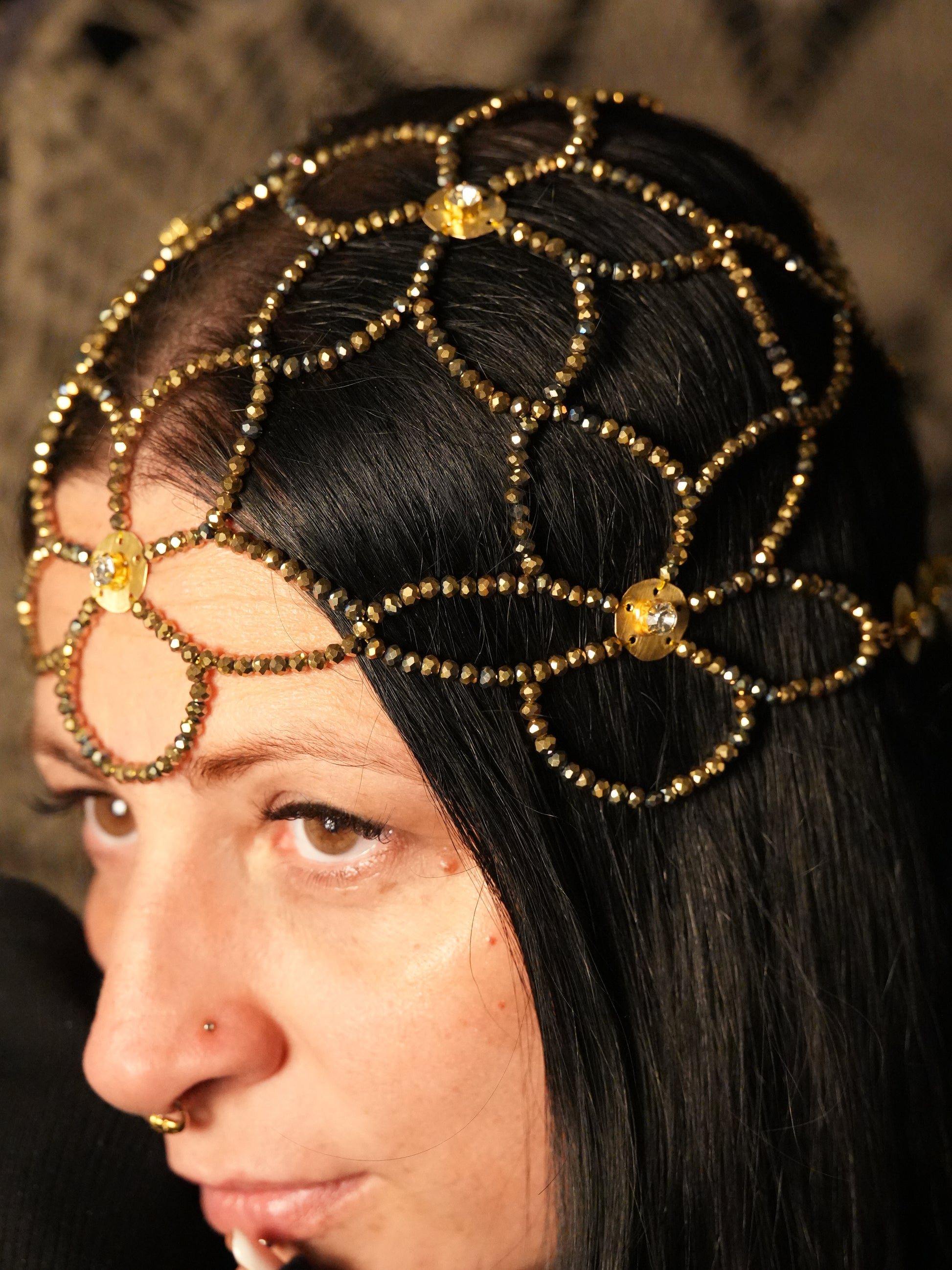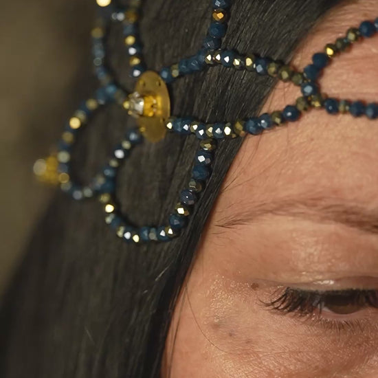 Esalta la tua bellezza con questa esclusiva head chain a motivo floreale, realizzata artigianalmente con 936 cristalli color oro sapientemente intrecciati. Il design sofisticato è impreziosito da placchette in ottone dorato, ciascuna decorata con cristalli trasparenti che catturano la luce con eleganza.