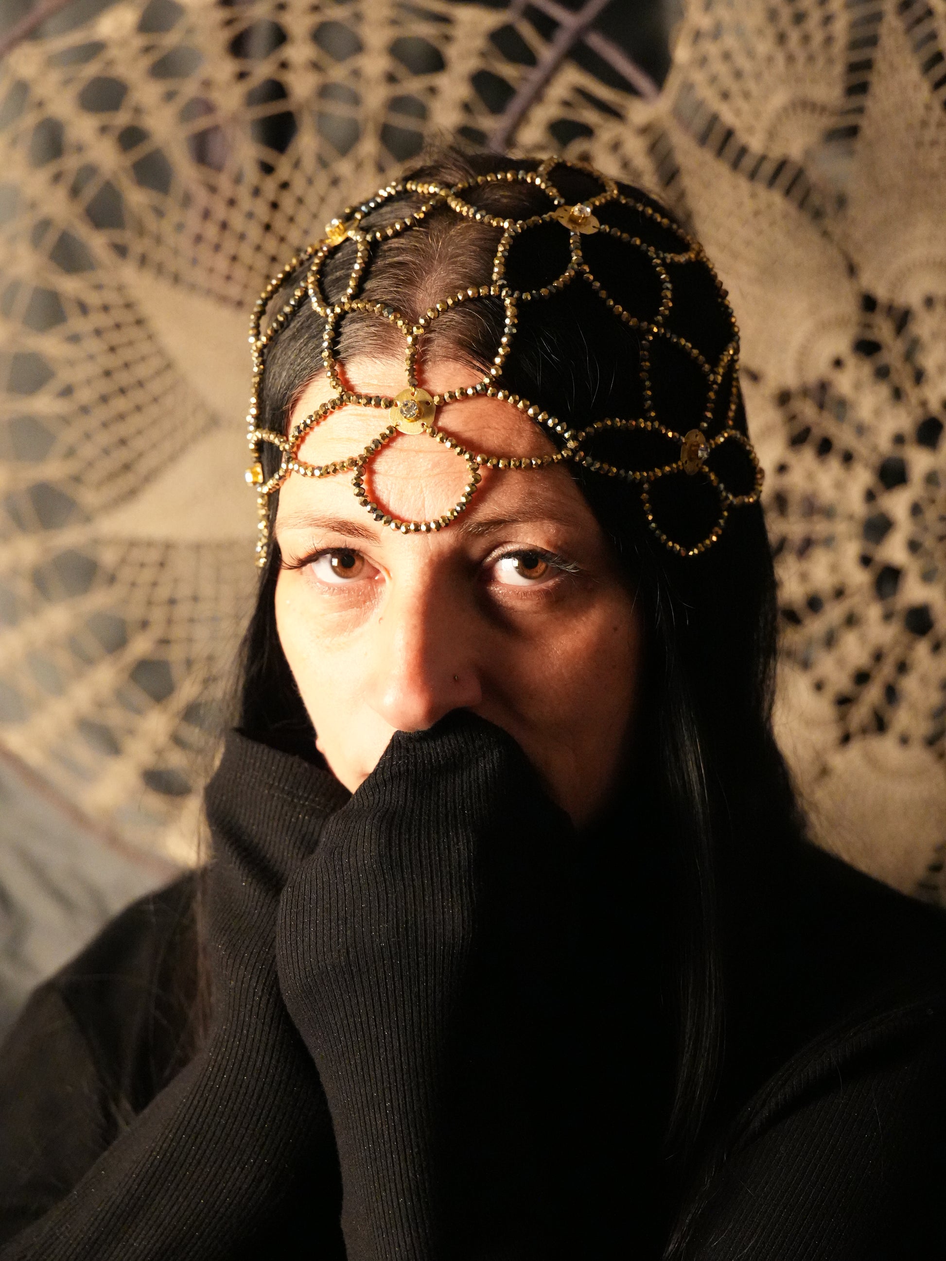 - 936 cristalli dorati incastonati a mano