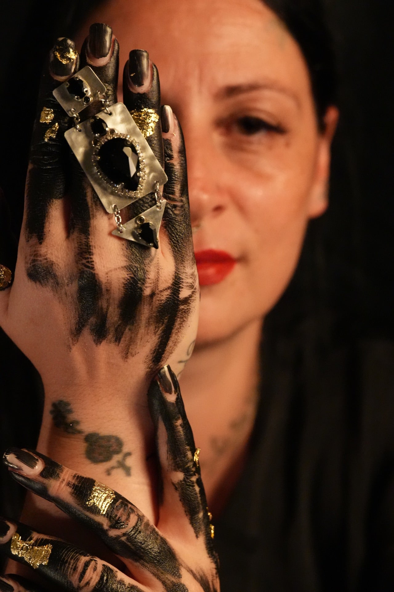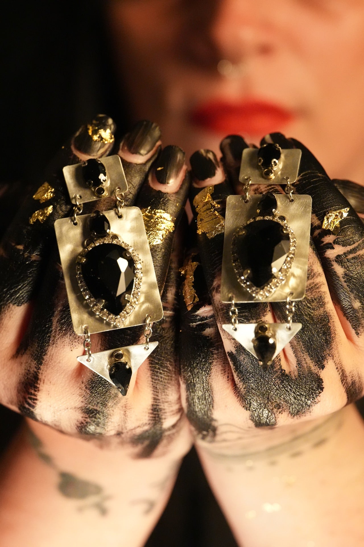 Questi orecchini artigianali in alluminio sono impreziositi da cristalli neri taglio geometrico, incorniciati da dettagli luminosi che creano un contrasto sofisticato e deciso.