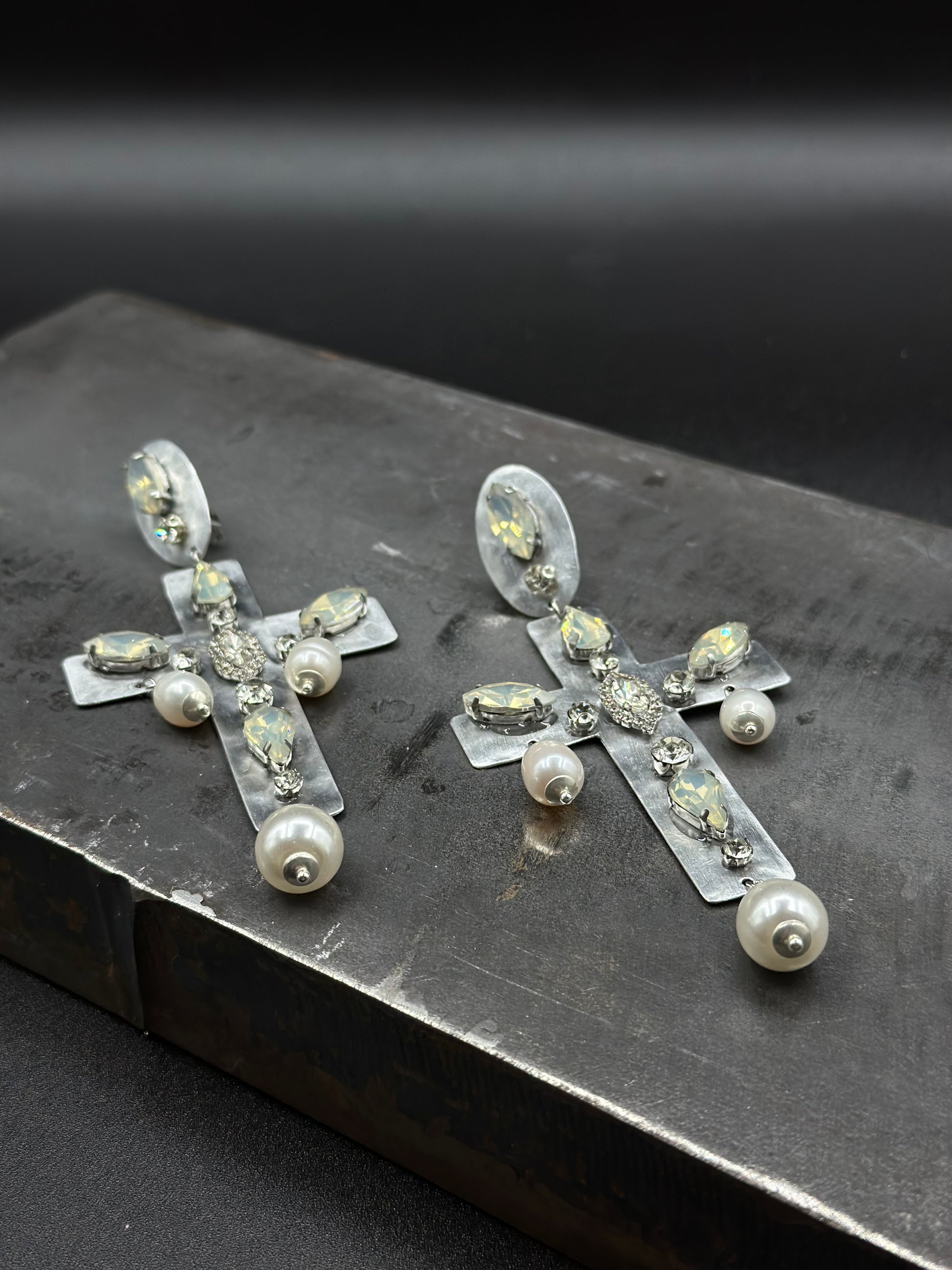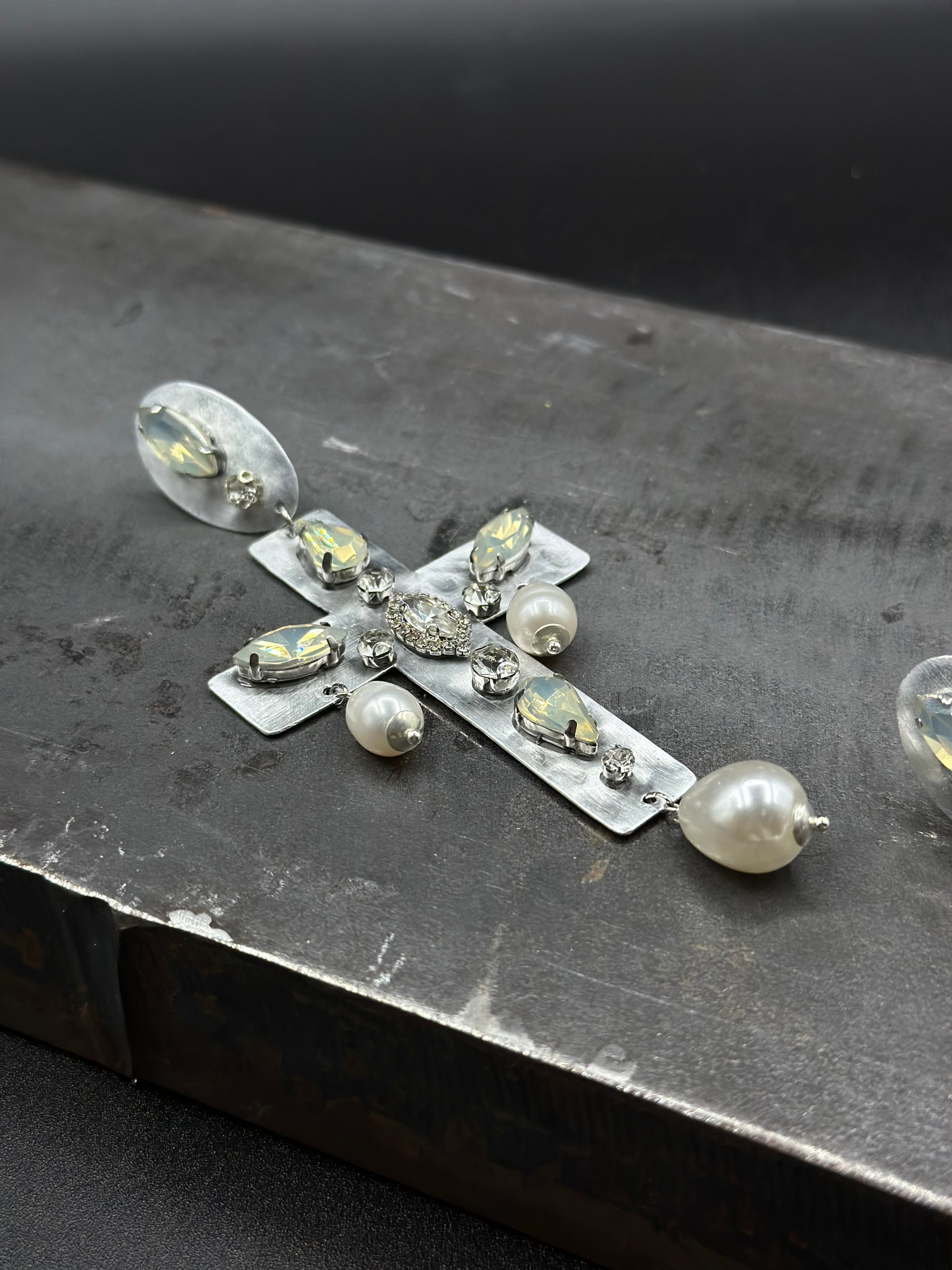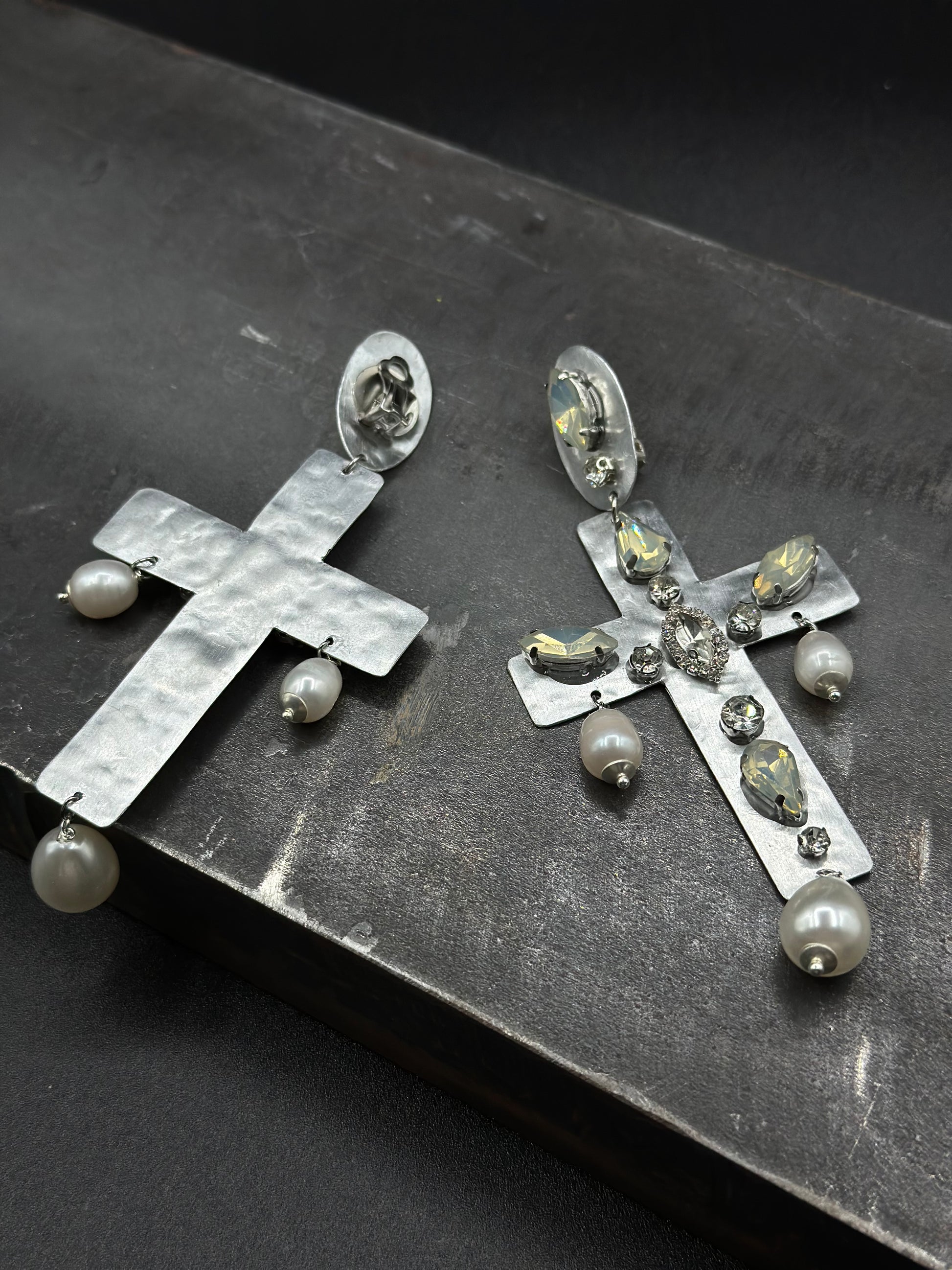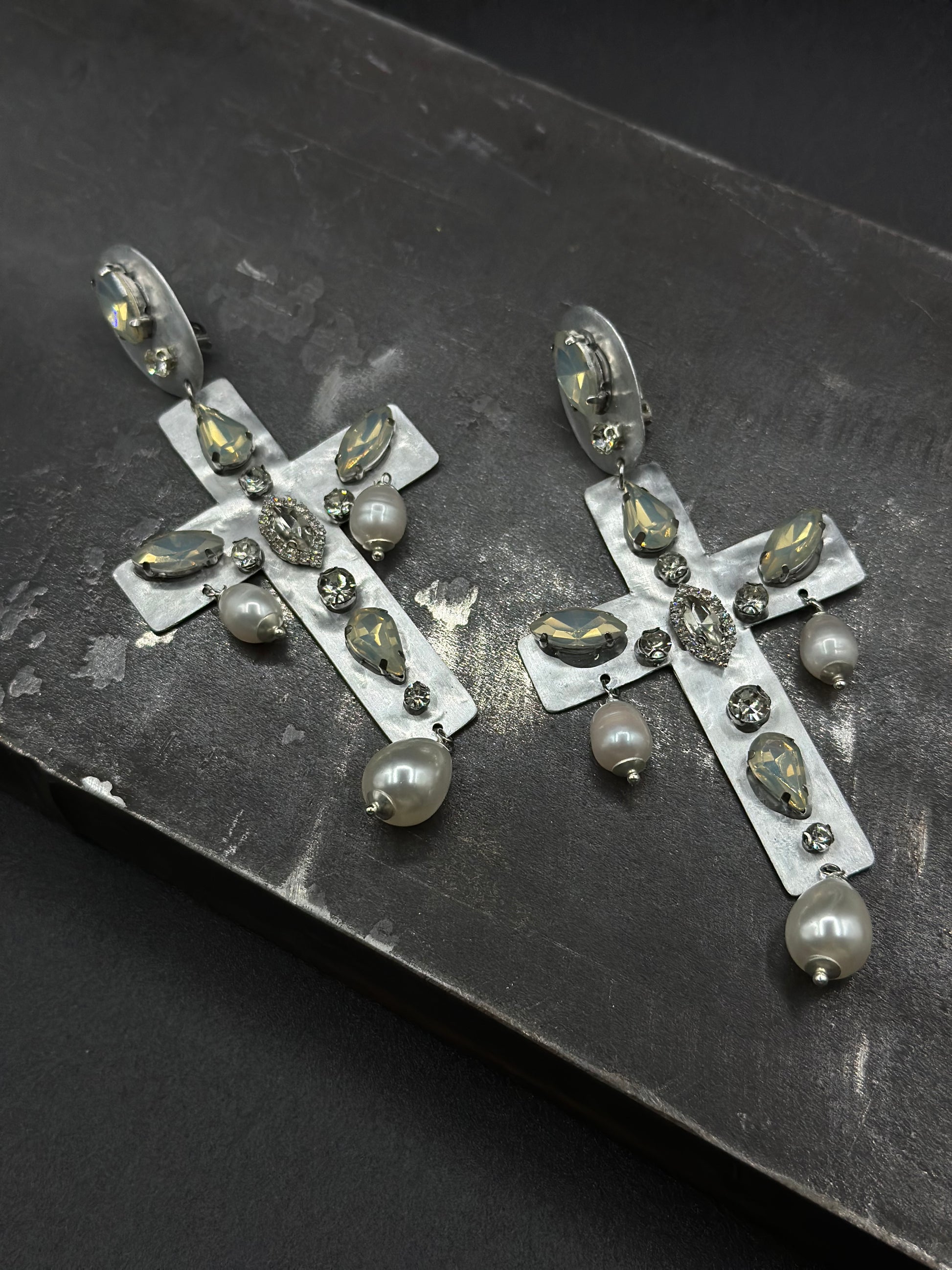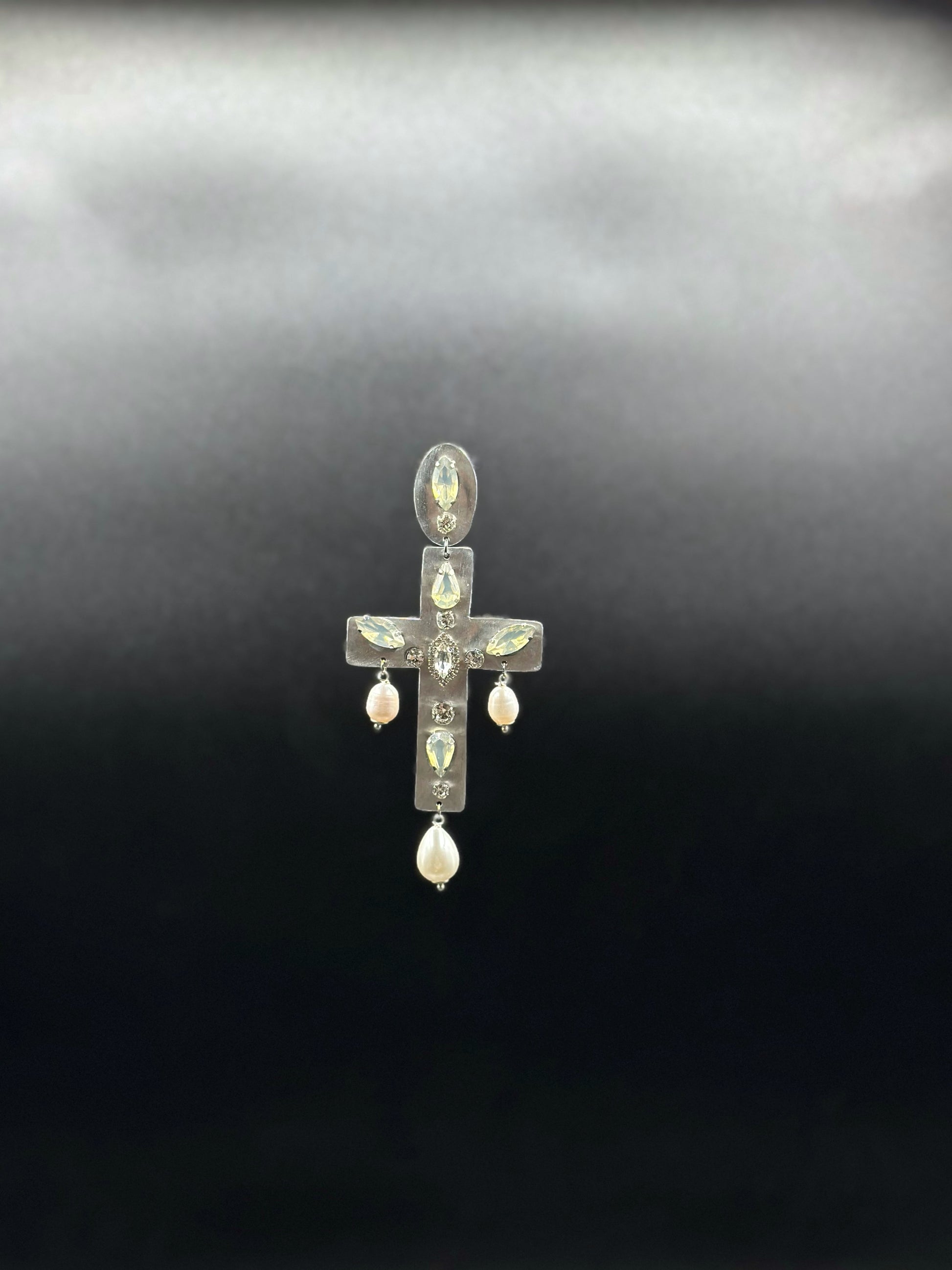 Orecchini pendenti a forma di croce, realizzati interamente in alluminio e decorati con cristalli luminosi lungo la struttura. Alla base e ai lati della croce scendono piccole perle bianche a goccia, che aggiungono movimento e luce ad ogni gesto, senza appesantire il lobo. La chiusura a clip li rende comodi anche per chi non ha i fori alle orecchie. Pensati per chi ama forme forti e pulite, con un’estetica che richiama il classico in chiave contemporanea.