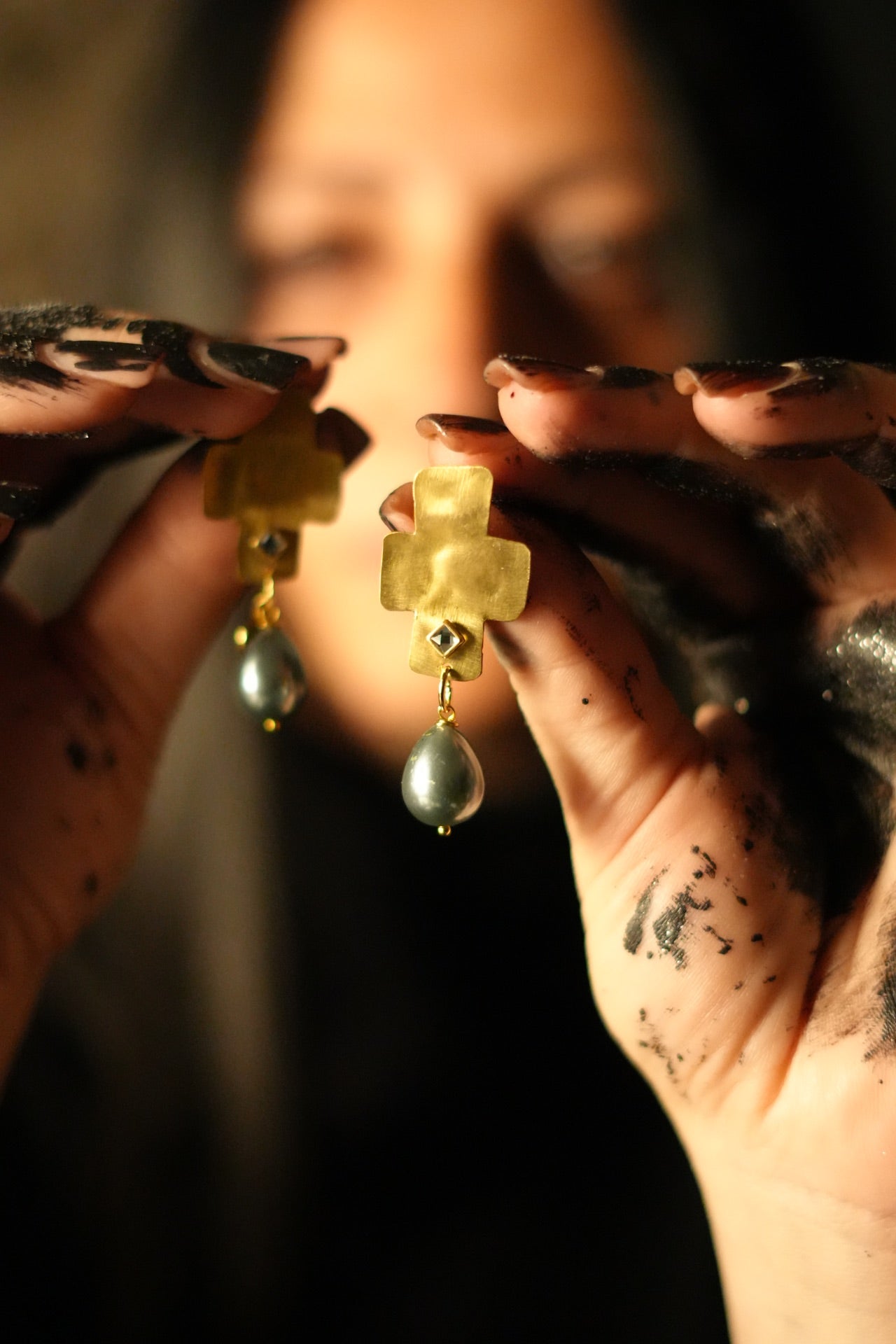 - Versione oro: ottone lavorato a mano, pendente in perla barocca grigia