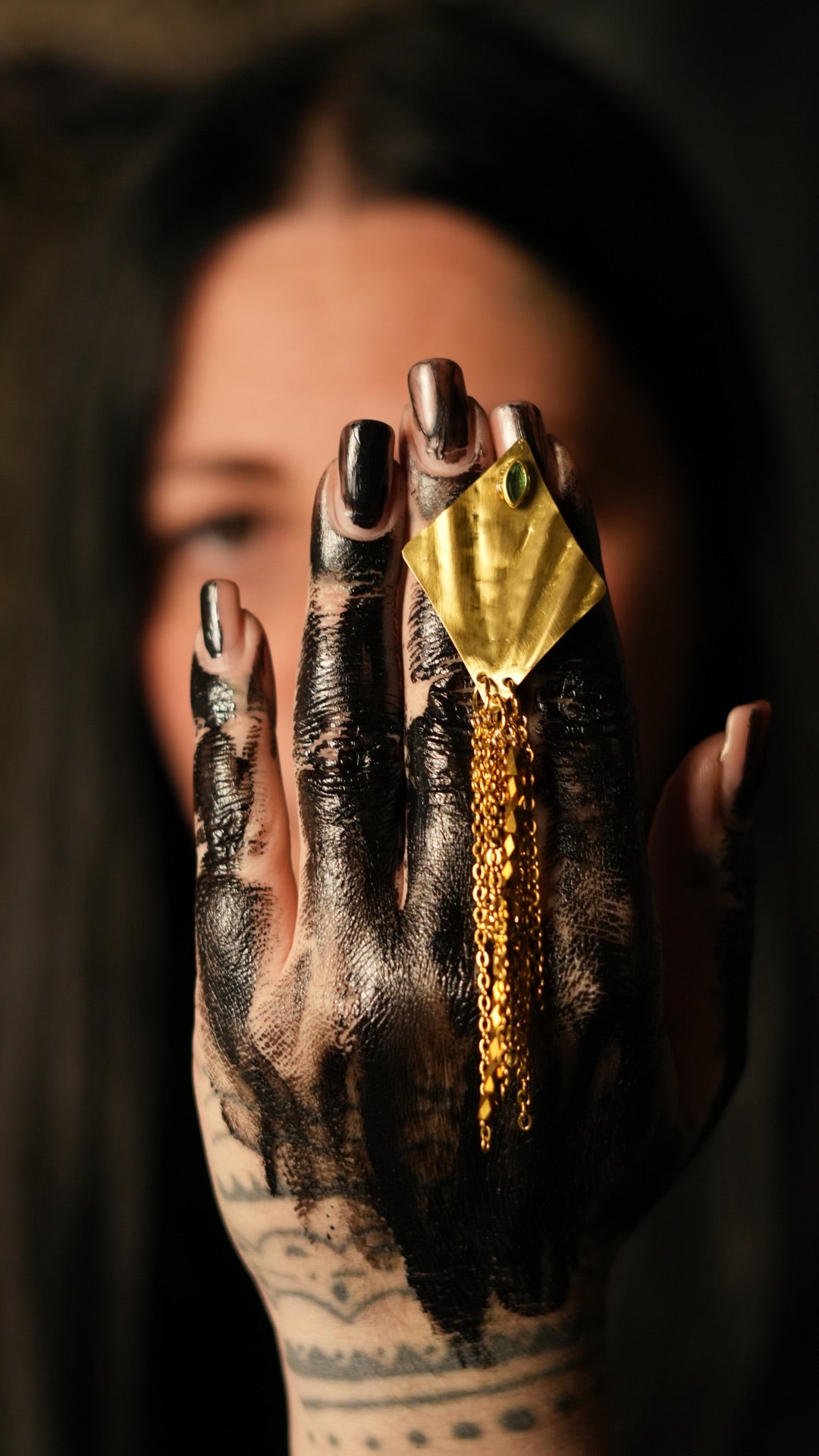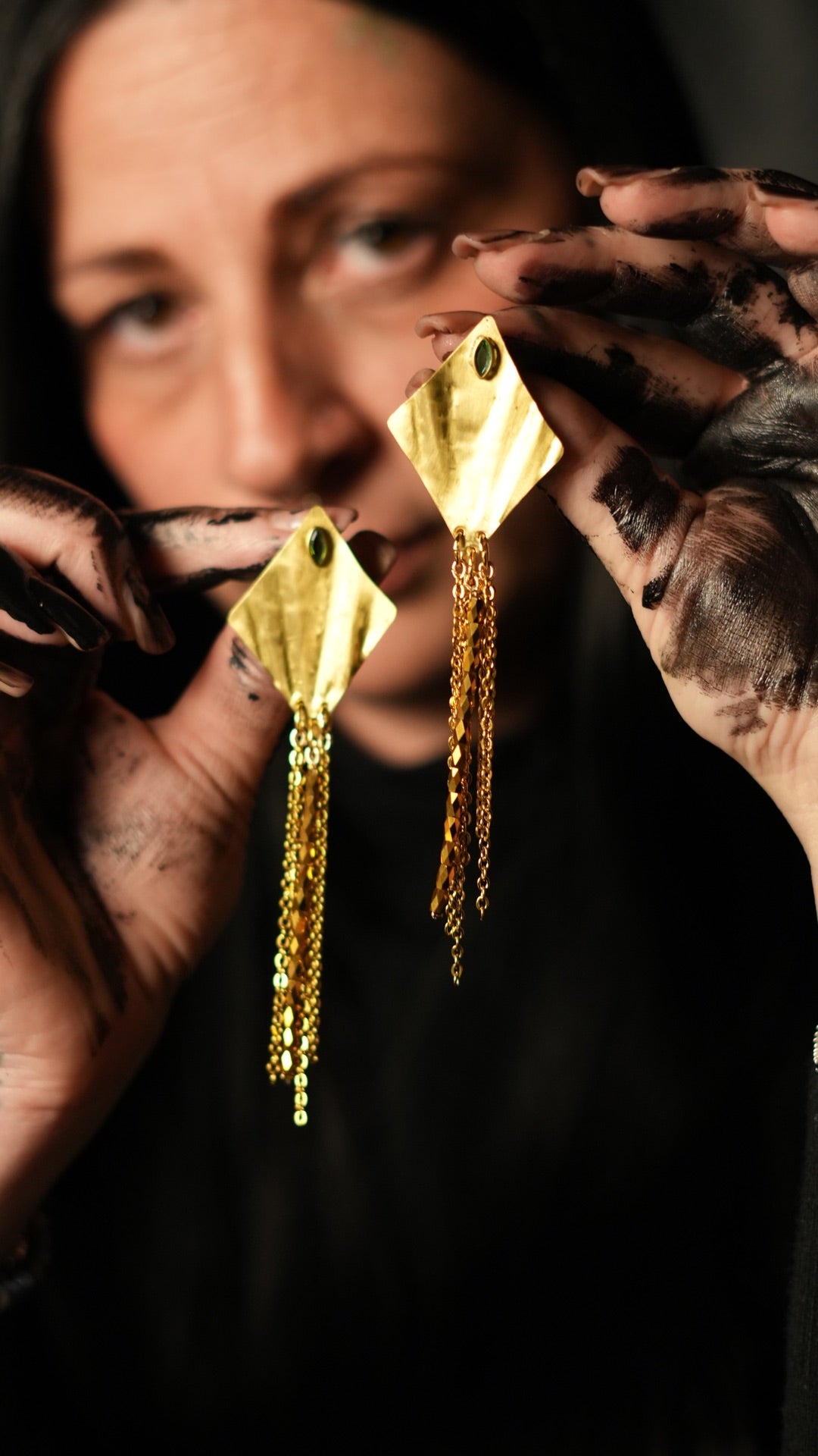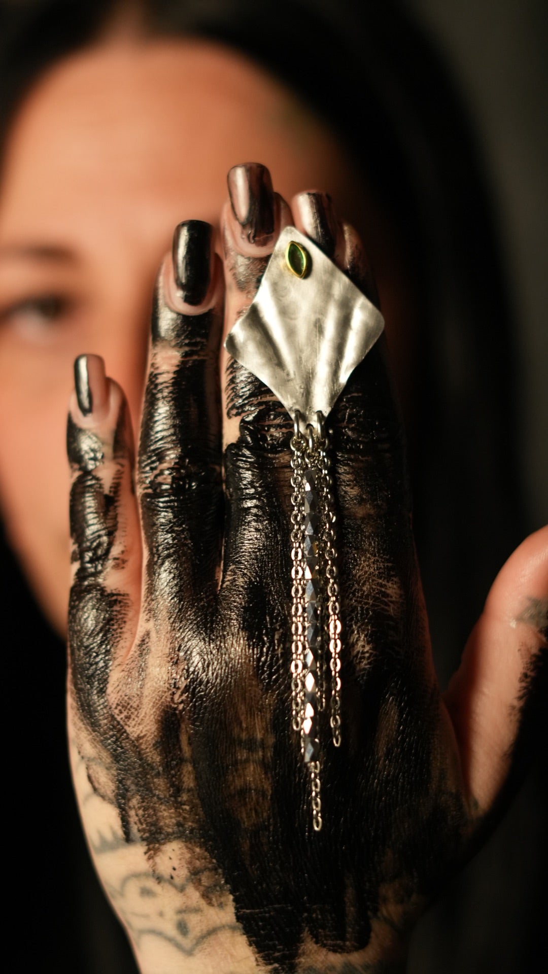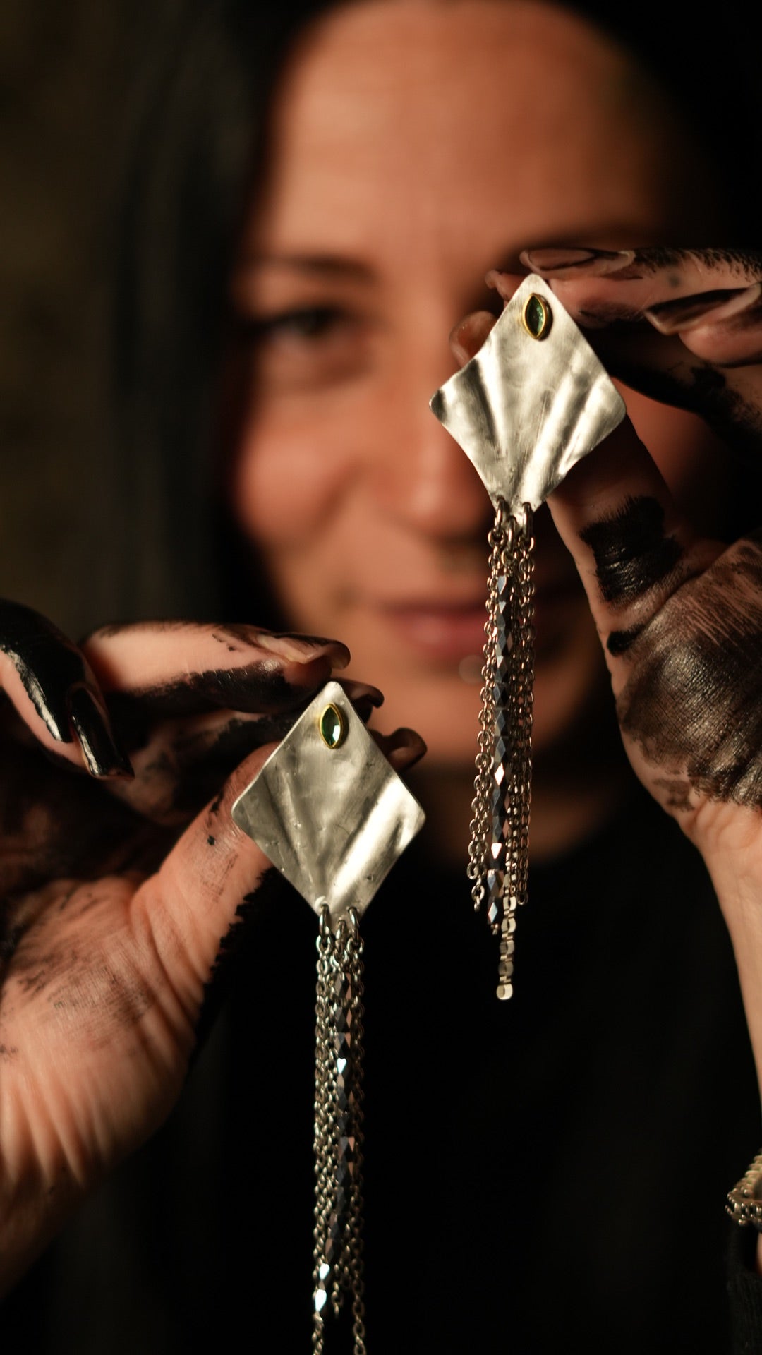 Una lastra martellata a mano, tagliata a rombo, da cui scendono cascate di catene e cristalli: movimento, luce e presenza in ogni gesto.
