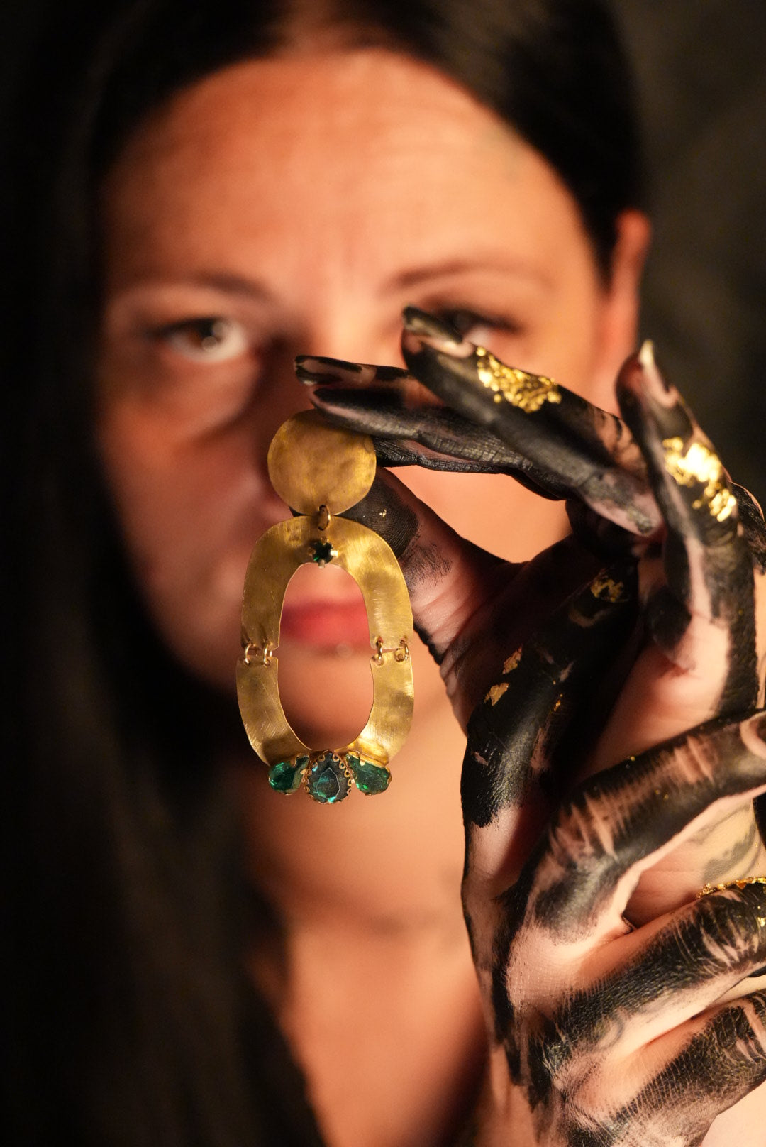 Impreziositi da cristalli verdi luminosi e rifiniti con una colata di resina che isola il metallo dal contatto diretto con la pelle, offrono comfort e sicurezza anche alle pelli più sensibili.